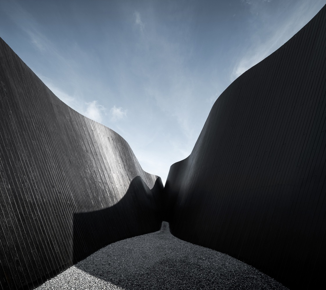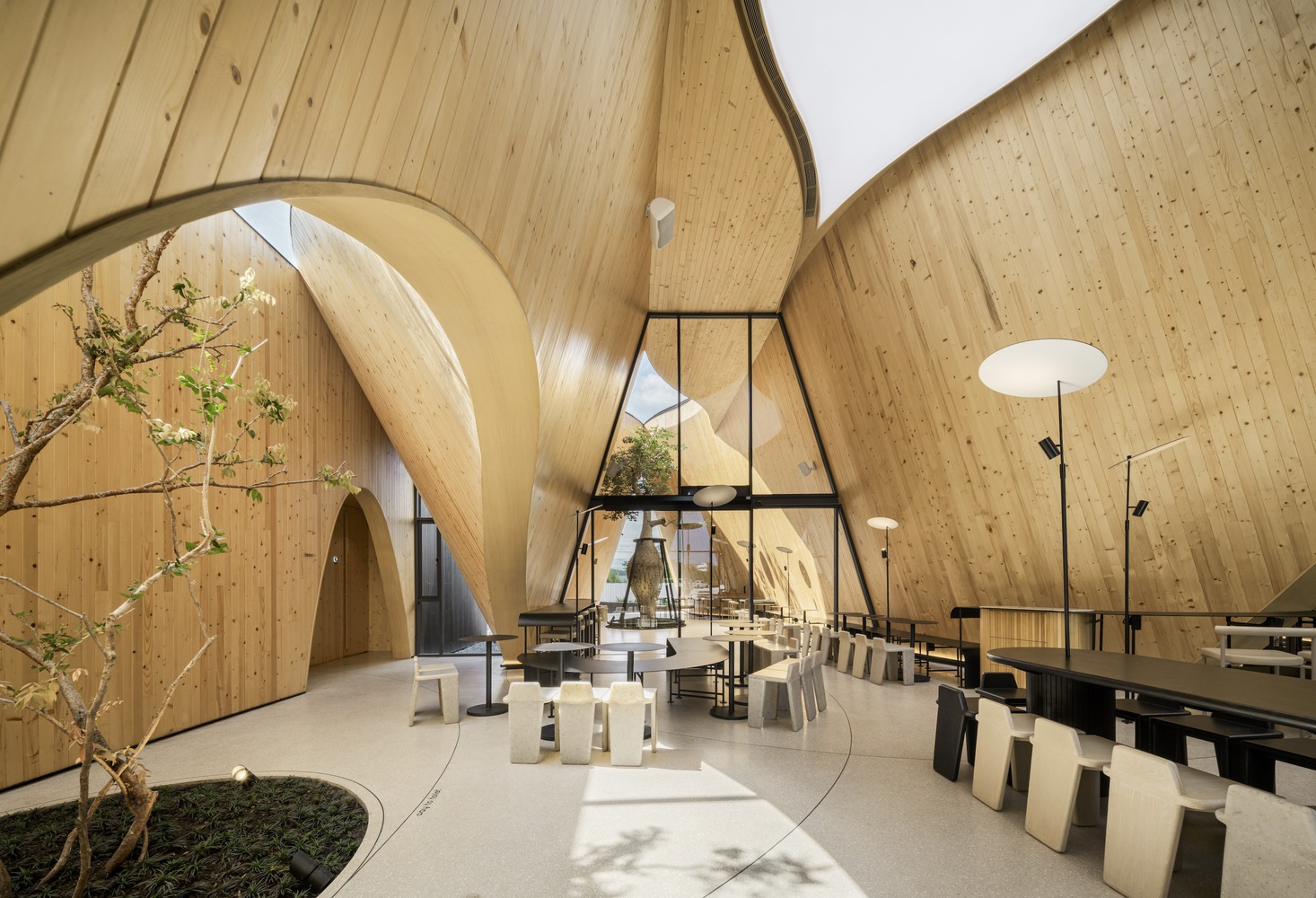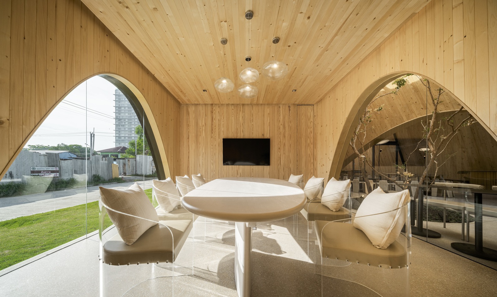 The café’s brand identity draws heavily from Japanese culture, emphasizing humble simplicity and meticulous attention to detail. This influence is evident in the exterior’s design, which features three simple, black-colored gable forms that provide a subtle contrast to the warm pine wood walls of the interior. As guests enter the café, they are guided through a space that morphs and bends with curves, leading them into a more dynamic and memorable area.