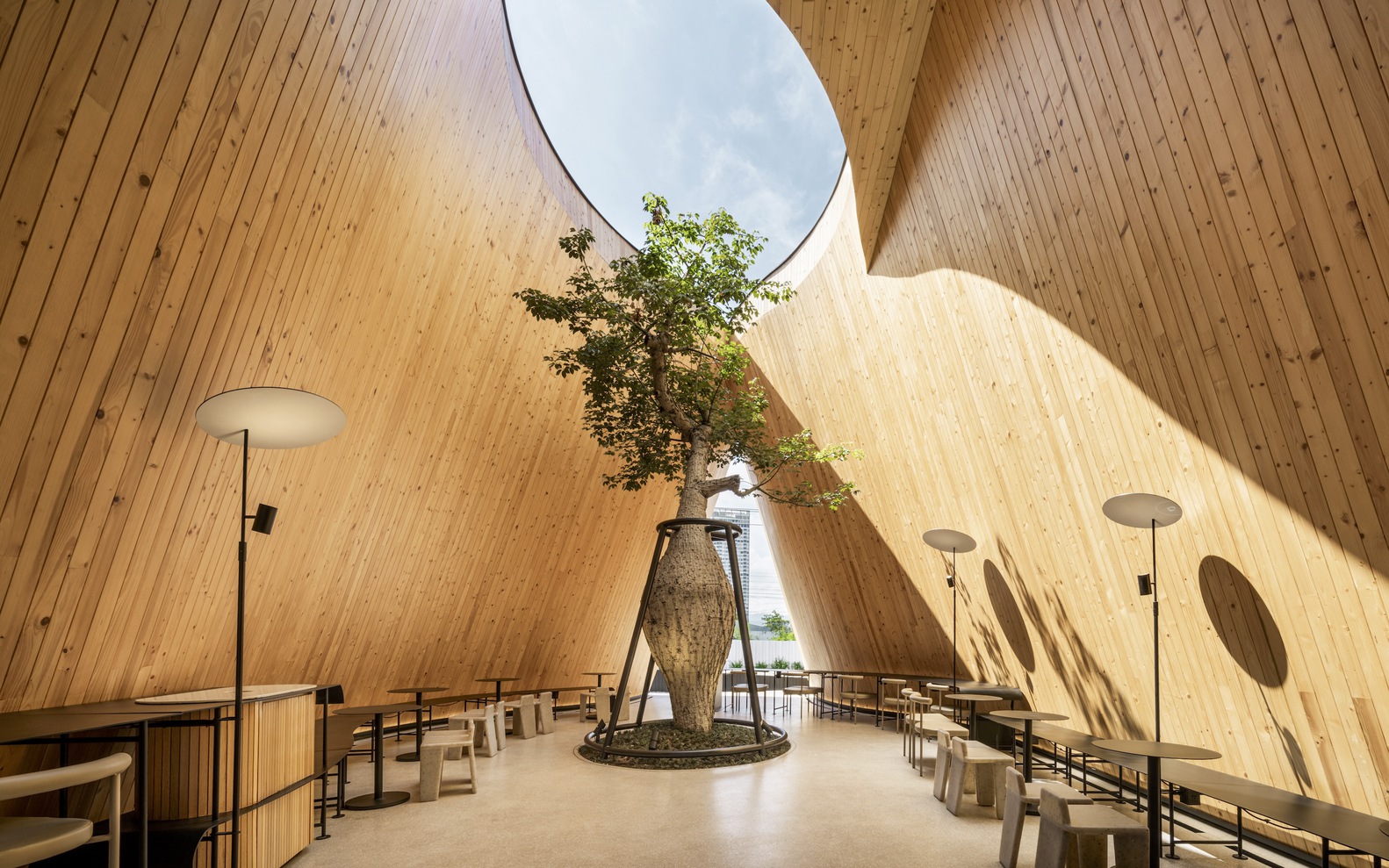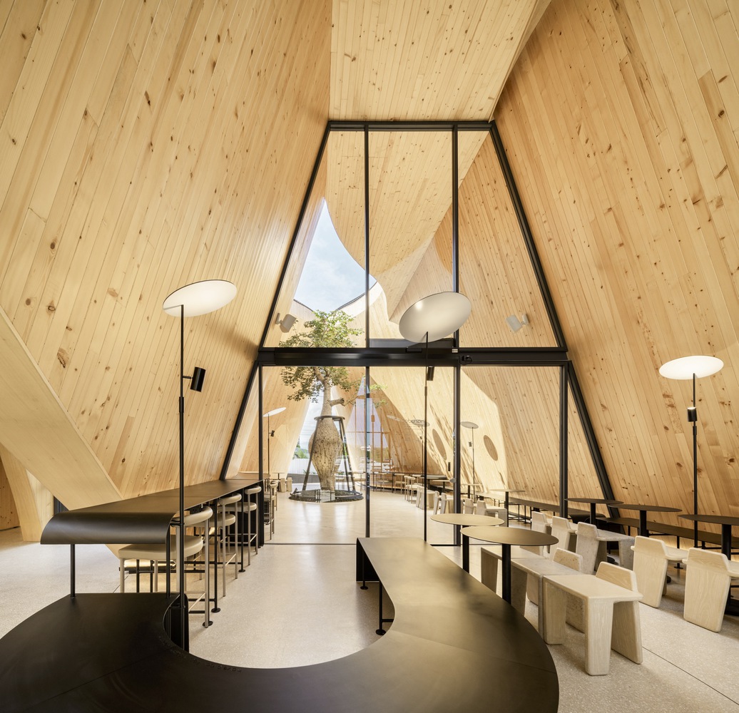 To create a more approachable, human-scale environment, the building is divided into smaller sections, each serving a different purpose such as the bar, coffee drinking zone, lounge, meeting room, and restrooms. The large gable roofs of each section are artfully separated at certain points, allowing the tree to extend through voids to the sky, creating a captivating semi-outdoor space. These voids add movement and dynamic to the architecture, letting in rain and sunlight, thus maintaining a connection with nature despite the enclosed setting. Inside, these voids are mirrored with Barrisol stretch ceilings that diffuse light, creating a softly lit, cozy atmosphere that visually connects the indoor and outdoor spaces.
