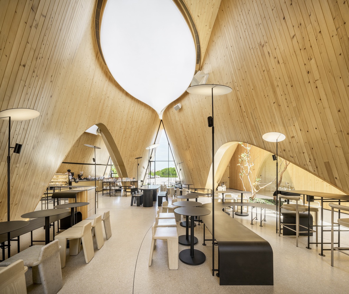 Harudot’s interior photography, captured by Beam from DOF Sky I Ground, showcases the unique design elements that define the café. The seating arrangement in the café flows continuously like a ribbon, wrapping around the interior and varying in height to accommodate different functions. Outdoor seating is crafted from a resin blend incorporating coffee grounds, rice, and leaves, echoing the café’s theme.
