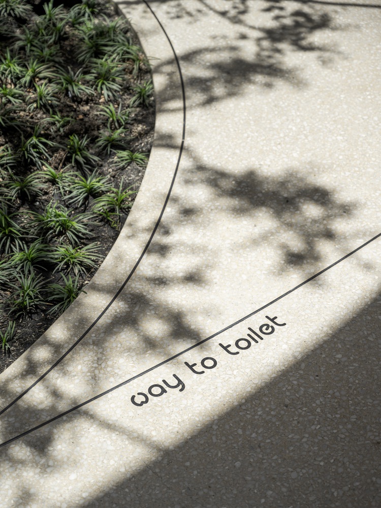 The café’s meticulous attention to detail extends to its graphic elements, including custom-designed fonts and signage inspired by circular dots and the spring season. The terrazzo flooring features circular separations with embedded quotes and words leading to various café functions, alongside a playful flower petal pattern that appears to radiate from the trees. This thoughtful integration of different elements creates a playful and engaging experience for customers, inviting them to discover the many hidden aspects of Harudot Café.