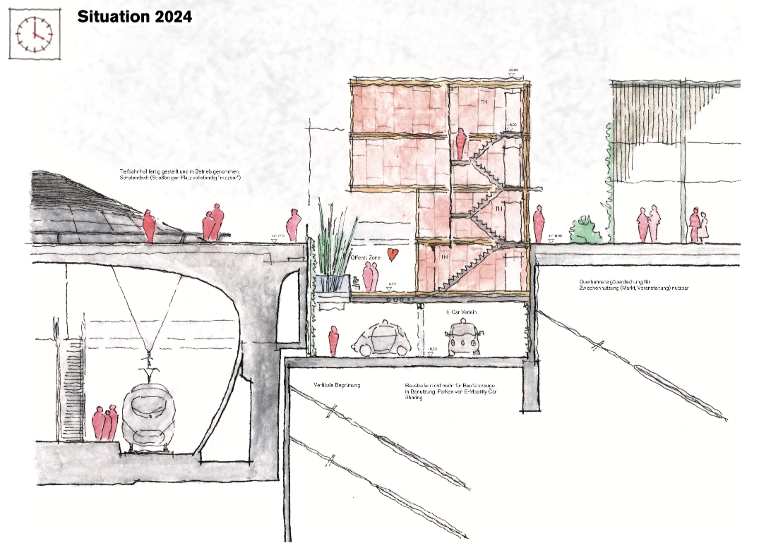 Stuttgart Central Station, which is currently under construction, shows a difficult spatial situation, which had previously been ignored by the planners and which actually occurred for several years. A current construction road (200m long, 6m deep, 13m wide) will cut through the Stuttgart city structure for about 8 years as a fallow area after completion of the new underground station. As a result of the situation that arise in the individual sections of the station and the adjacent surrounding development of Rosensteinquartier, a constantly and easily adaptable building system had to be developed here. In this case, 5 situations have been developed as an example, as well as an interim utilization concept for the old track roof of the station.