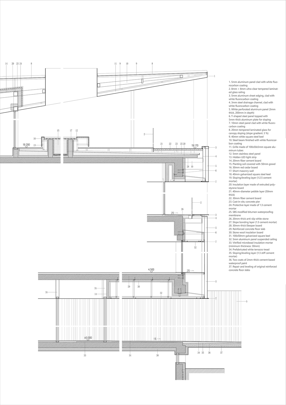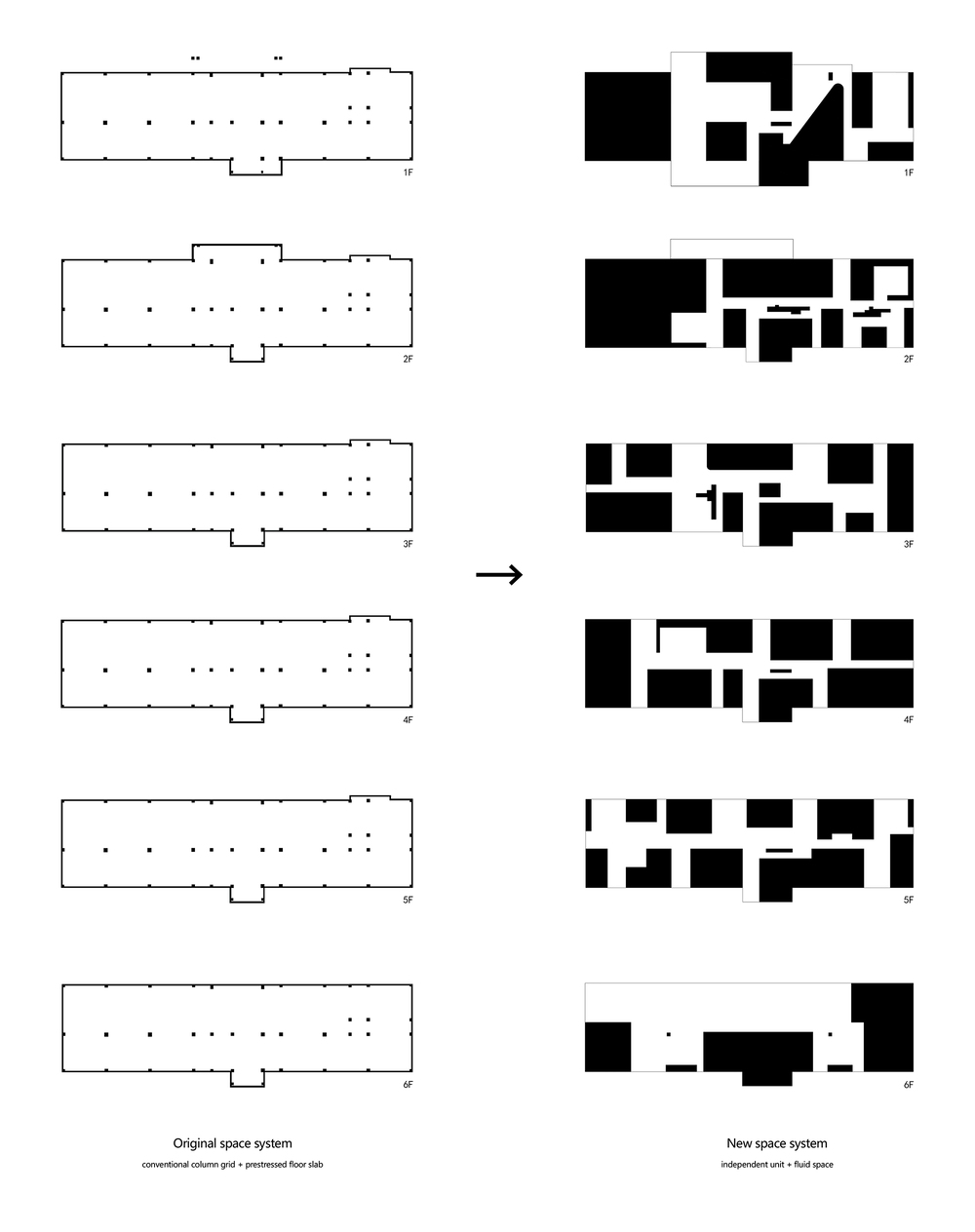 The definition of the functional attributes of building is not a very clear distinction, and human use cannot be simply regulated. Not limited by the original floor height, we use the location of the floor slab that has been demolished and modified in the creation of internal space to open up the connection among floors and establish a new space height of the public part, and also reduces the secondary damage caused by the original structure.