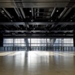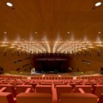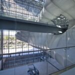 The interior is organized around a carefully designed architectural promenade. A large entrance hall connects visitors to the main functional spaces, including a flexible exhibition hall with a capacity of up to 6,000 people and an auditorium housed within the Cloud. Material choices—such as travertine, glass, fiberglass, and wood—are used deliberately to distinguish spatial zones and guide movement.