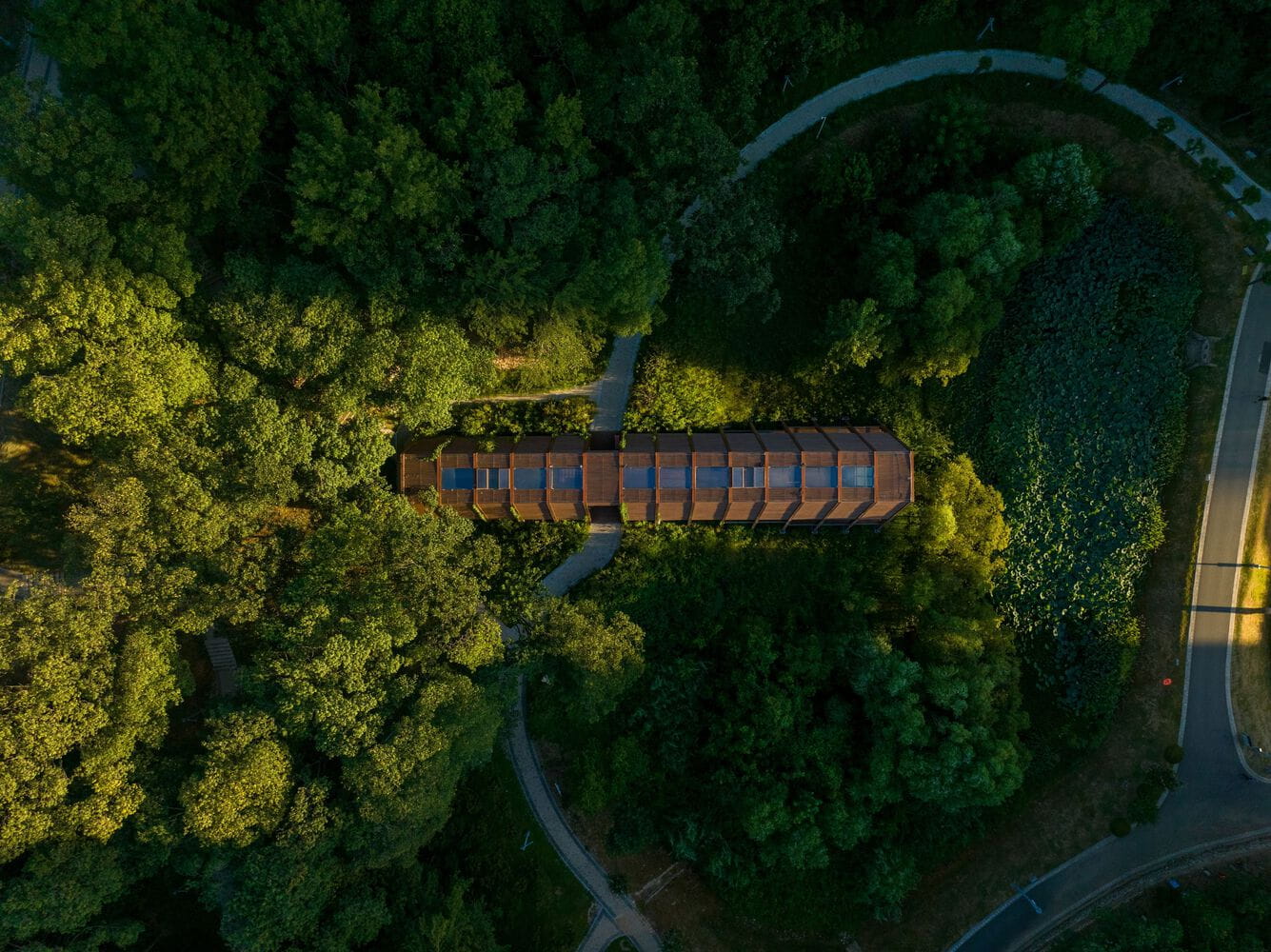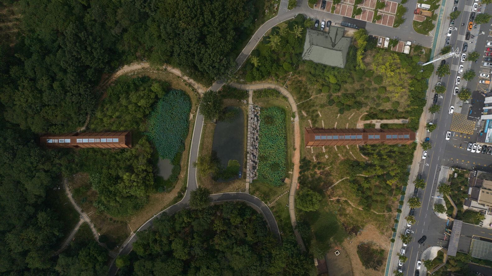 Set within Yangshan Park in Xinyang, a rapidly growing city of 12 million in central China’s Henan Province, the House of Knowledge forms part of the ambitious 20 Bookhouses Initiative aimed at enriching cultural life across the metropolis. Rather than appearing as a singular monumental object, the project is composed of two modest yet deeply intentional buildings: a community library with exhibition spaces, and a tea house dedicated to informal gathering. Between them, three small lakes unfold across a biodiverse landscape, creating a calm spatial threshold that mediates between the dense surrounding city and the slower rhythms of the park.