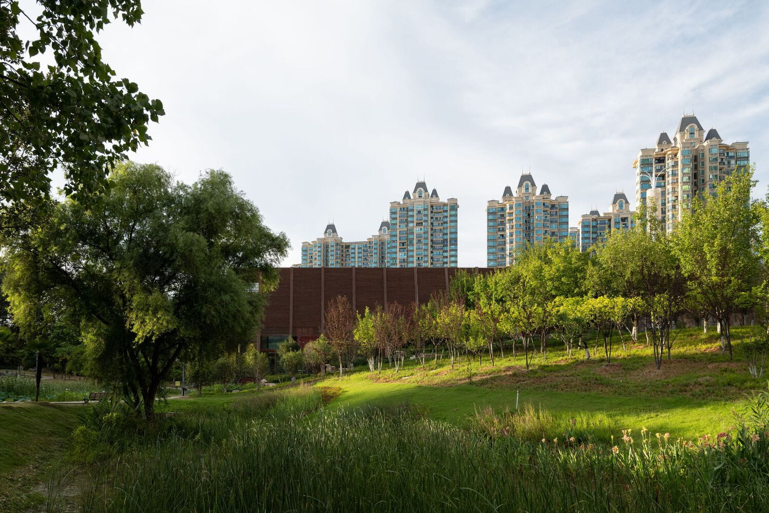The surrounding park is not treated as decorative scenery but as an active educational landscape. Community gardens, ponds, and native planting zones are structured according to permaculture principles, allowing residents to participate directly in cultivation and care. Over time, visitors can learn about biodiversity, water cycles, and ecological balance through hands-on engagement rather than abstract messaging.