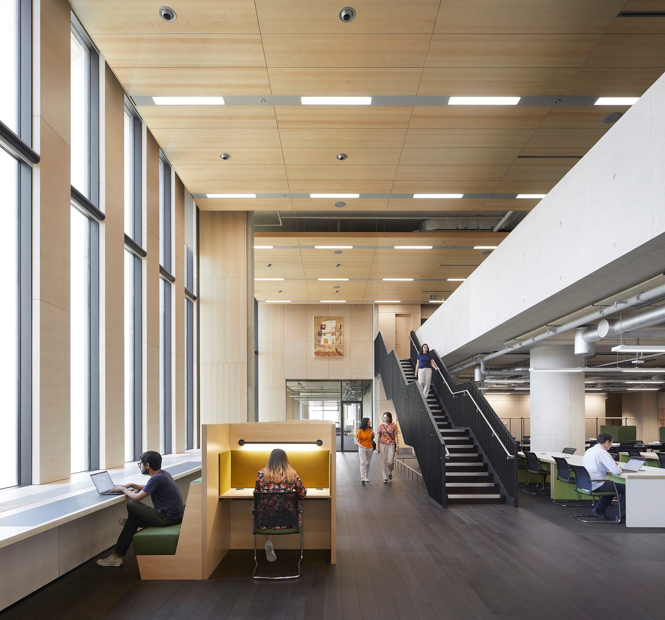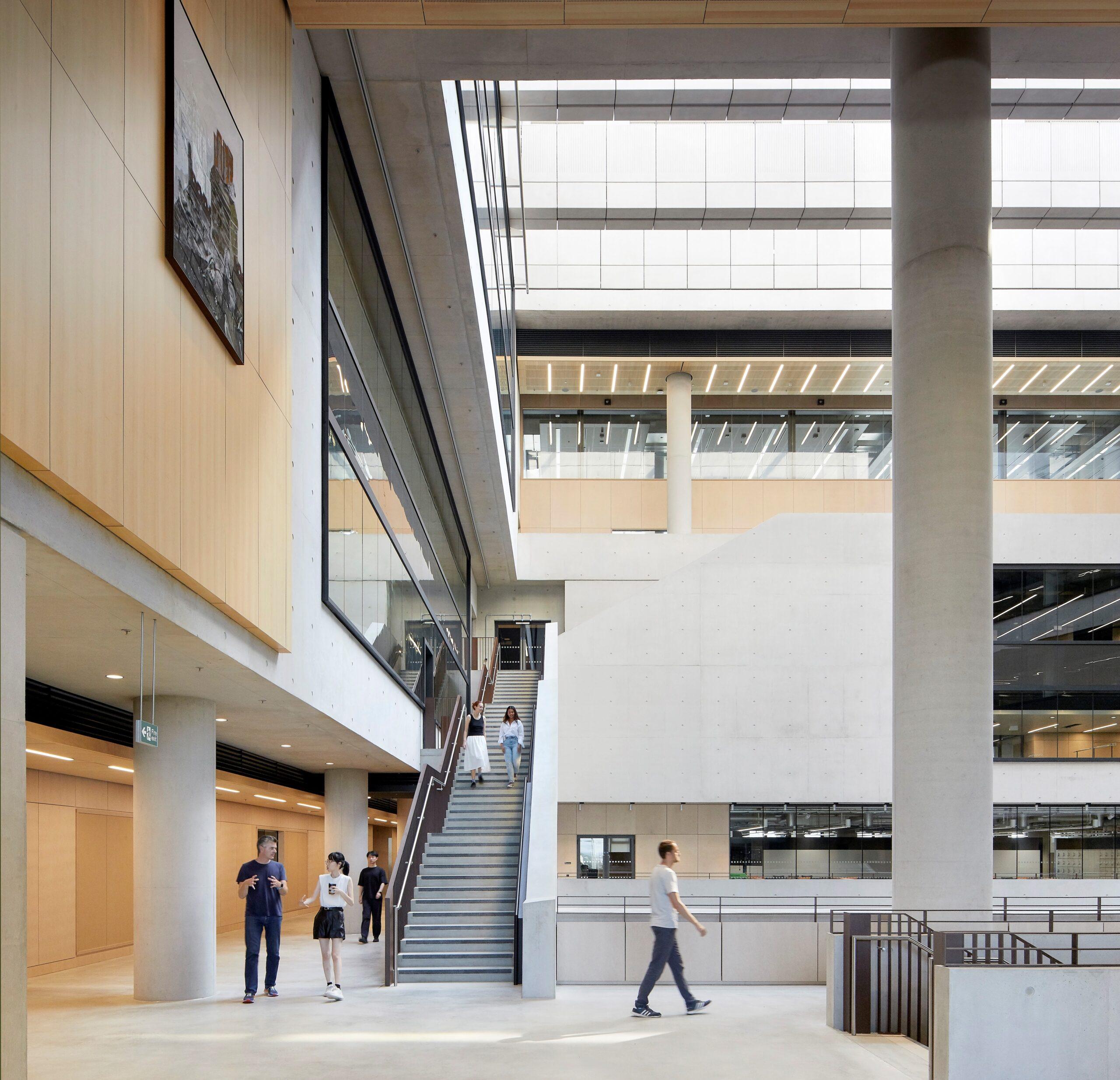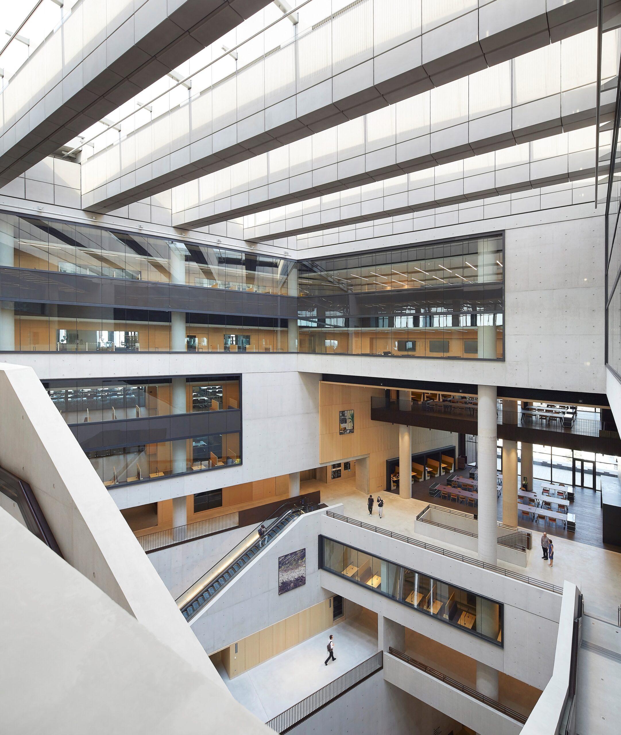 Connecting the vertical tapestry of activities within the building is a central, daylight-infused atrium, which, along with visible circulation routes, like staircases and escalators, provide additional platforms for spontaneous interactions and encounters. The building also houses a myriad of additional facilities like fabrication workshops, media studios, exhibition areas, design studios, lecture theaters, a library, and spaces intended for collaboration and local business engagement.