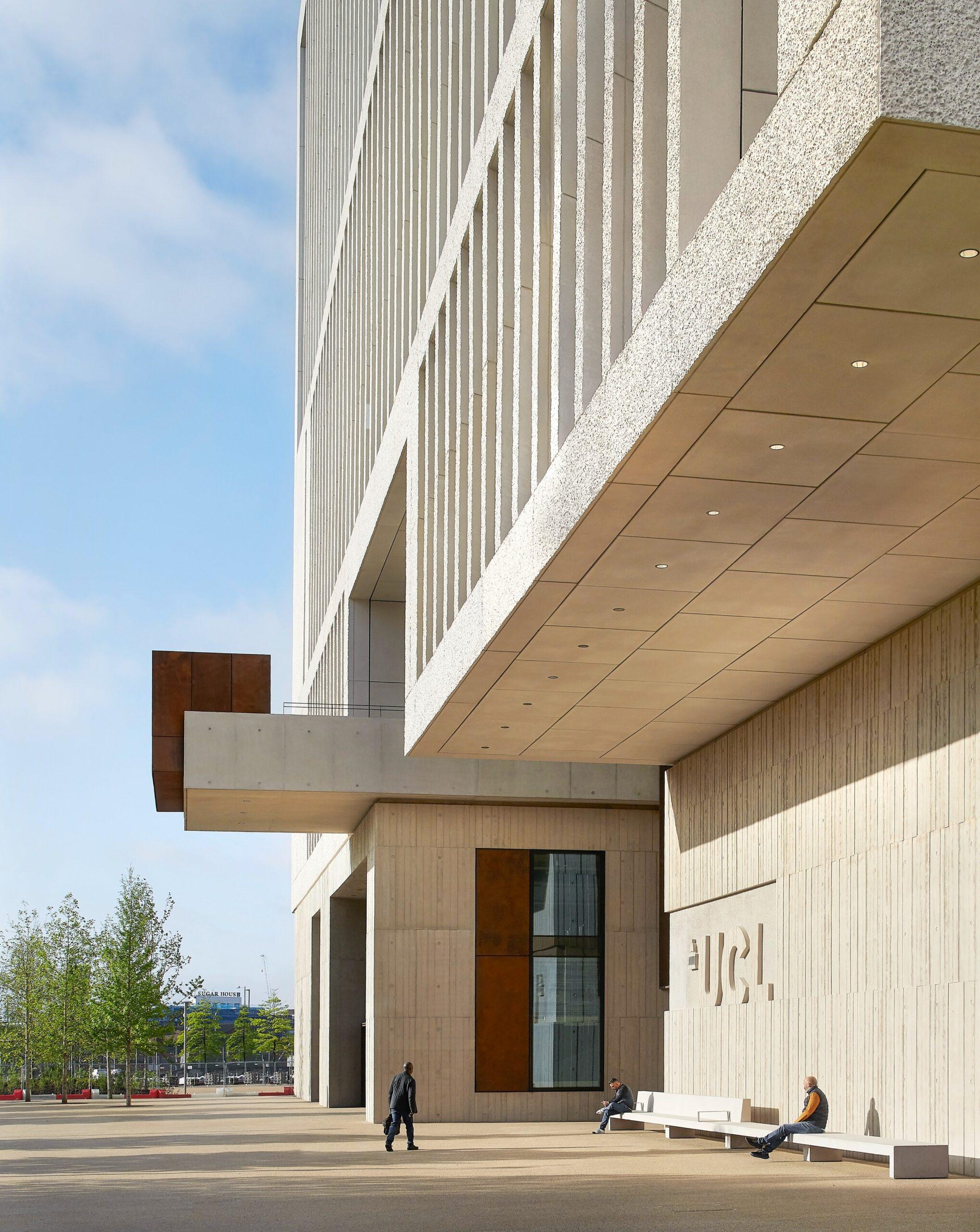 Deviant from the contemporaneous affinity for glass-heavy, light curtain wall facades, Marshgate’s architectural vernacular seeks to echo the sturdiness and perpetuity of UCL’s original Bloomsbury campus. Its massing also pays a subtle homage to the site’s industrial lineage, while concurrently responding to the audacious, sculptural forms of its neighboring Olympic structures. Engulfed in in-situ and precast concrete panels, accentuated by nuanced tones and textures, the façade is composed of timber board-marked concrete on the lower and upper levels, optimally designed for natural light and ventilation, exuding sustainability, a core aspect of UCL’s foundational mission.