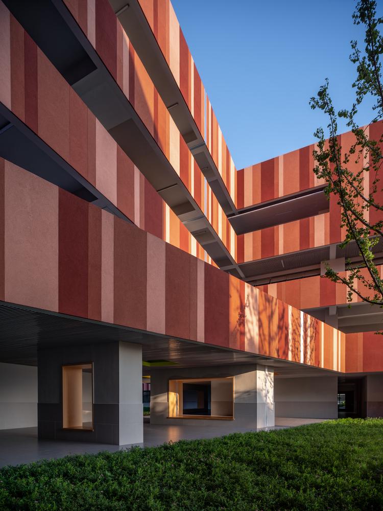 The historic ginkgo tree and its adjacent old-style courtyard are distinct from the rest of the campus. The school’s architecture does not mimic these older elements but rather coexists with them in a contemporary manner. The school’s colorful façades serve as a backdrop to this historic area, and an extended corridor with outdoor seating is designed for enjoying the surrounding views. Overall, Fengpu Elementary School’s design reflects a thoughtful consideration of China’s general school environment and the complexities of urban renewal in suburban Shanghai.