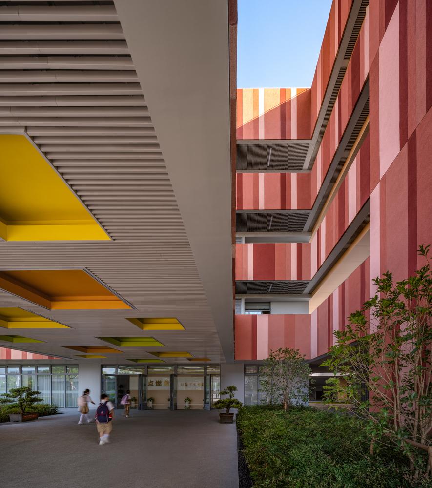 One of the most striking features of the school is its vibrant exterior, which signifies a new identity for the changing urban landscape. In contrast, the interior spaces are painted in muted gray tones to provide a serene atmosphere conducive to studying. The exterior and interior designs, while distinct, seamlessly integrate with each other.