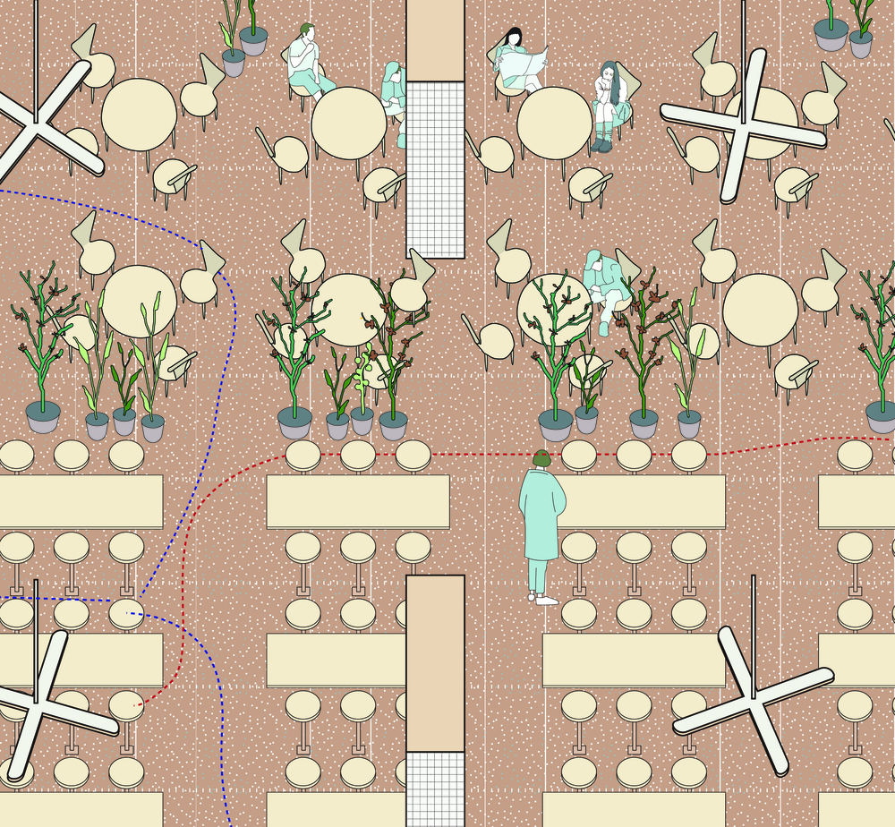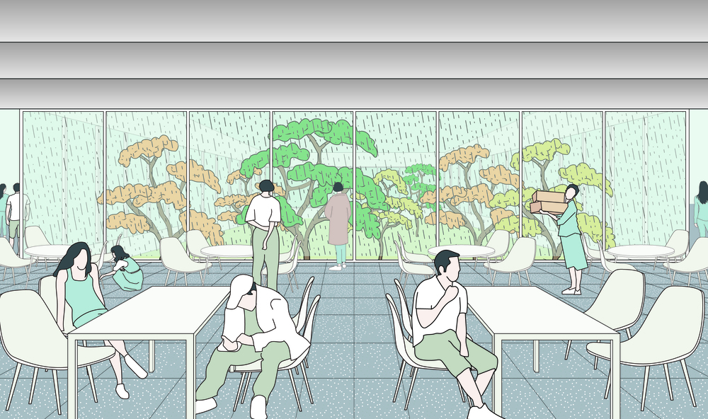 By introducing a twist to the conventional orthogonal grid system in the mat+courtyard typology, we integrate the building better with the site, enhancing informal educational spaces and overall lighting quality. The interconnections of the internal courtyards not only improve the efficiency of on-campus traffic but also foster interdisciplinary communication and collaboration. Furthermore, the internal courtyards within various educational spaces are marked by their unique flooring, color palettes, material choices, vertical design elements, and spaces. These elements serve as visual markers and contribute to distinct place-making spatial experiences, helping students find their way around the campus without falling into a monotonous routine.