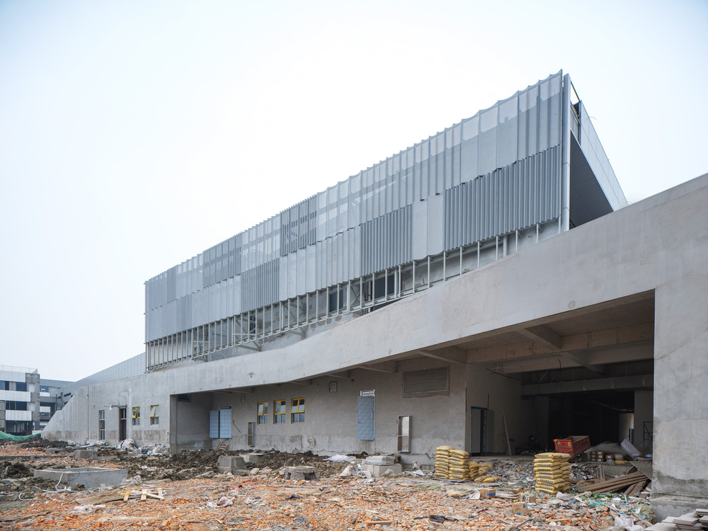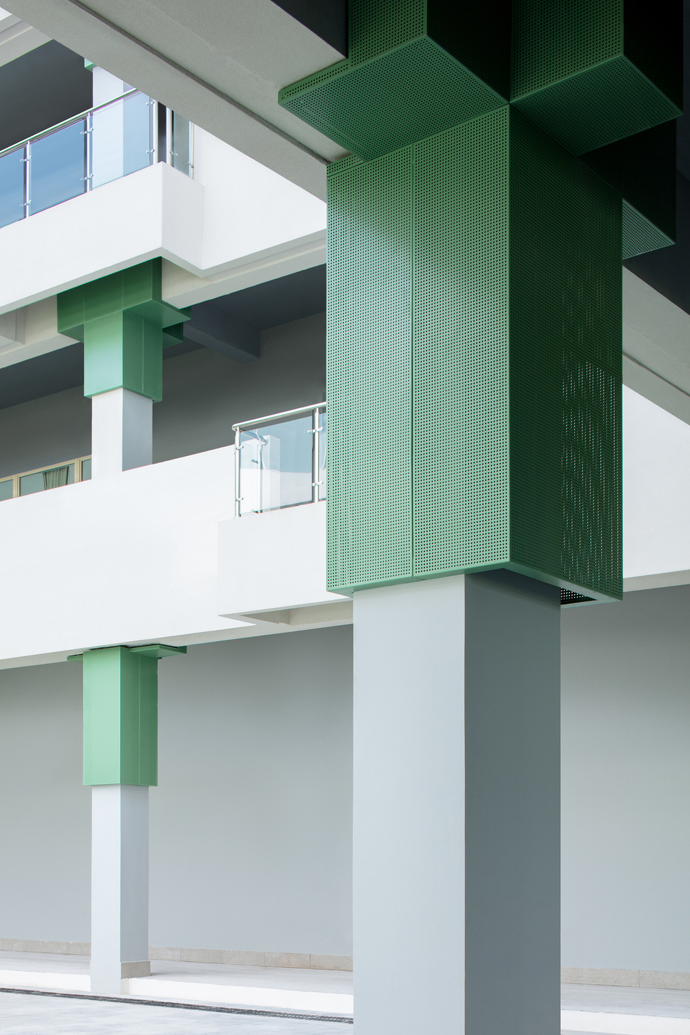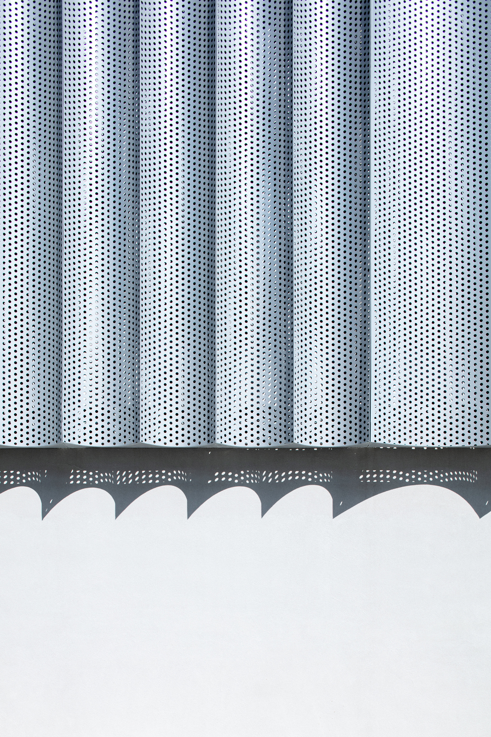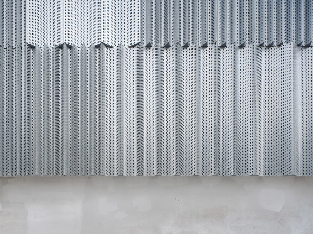 The building façade reflects both continuity of the campus and differentiation between various functions. The undulating GRC panels of the classrooms and perforated aluminum panels of the auditorium are grouped in various ways to create dynamic façades under different lighting conditions. Each façade incorporates three modular units of various curvatures, carefully arranged in a systematic yet randomized configuration, allowing perceived continuity on the façade with local variations.