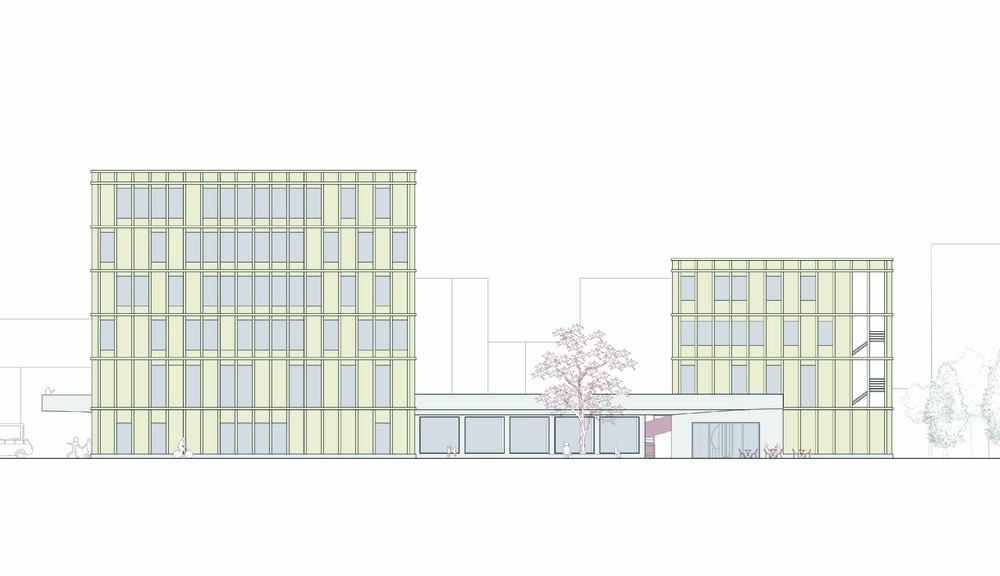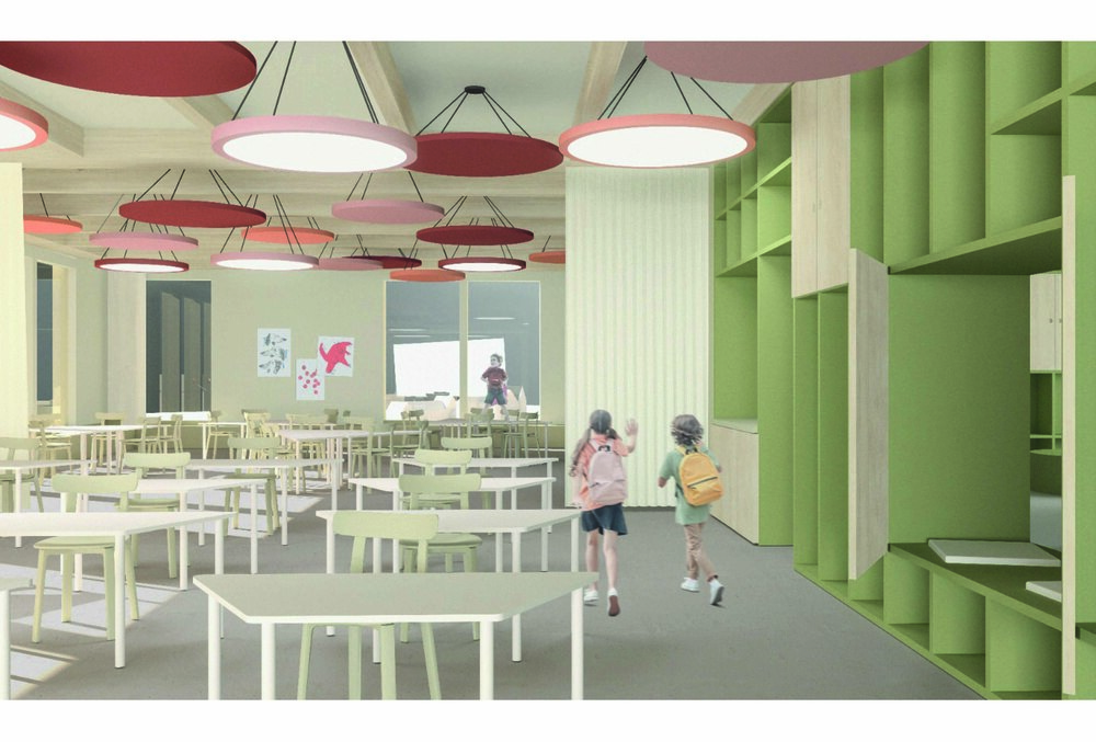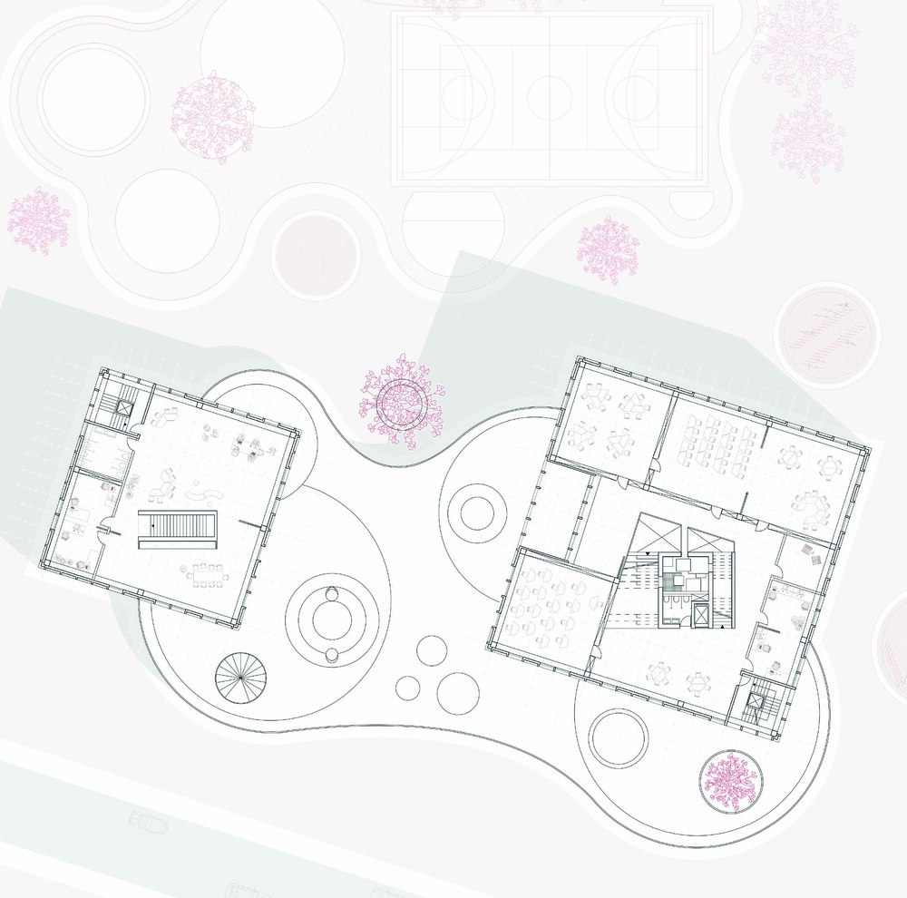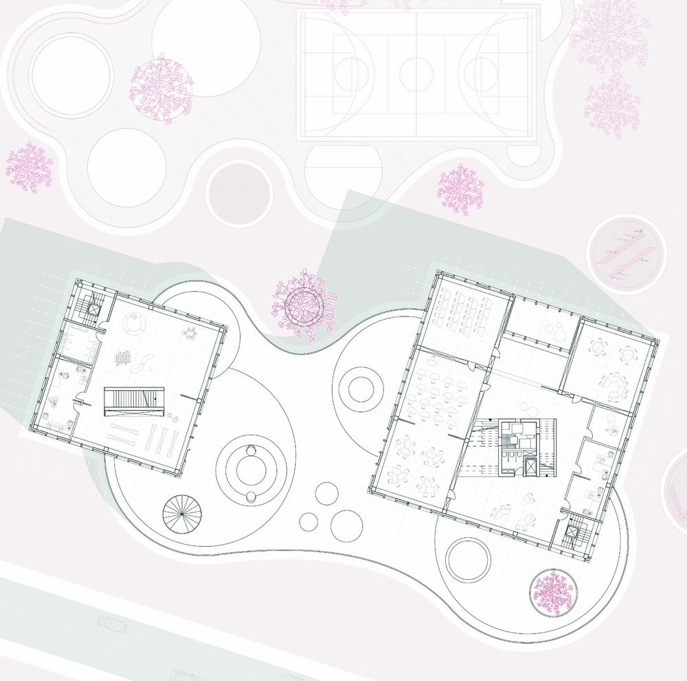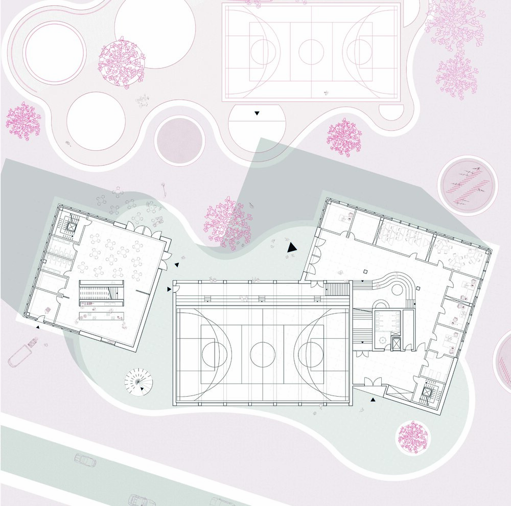 My design aims to be the centerpiece of the neighborhood, fostering identification with the location and strengthening community ties. In addition to the school building, I plan a community center that is autonomously accessible and can be used exclusively for school activities or externally as needed. Thus, the cafeteria becomes a parent café in the afternoons, and the after-school care facility transforms into a rentable course room.