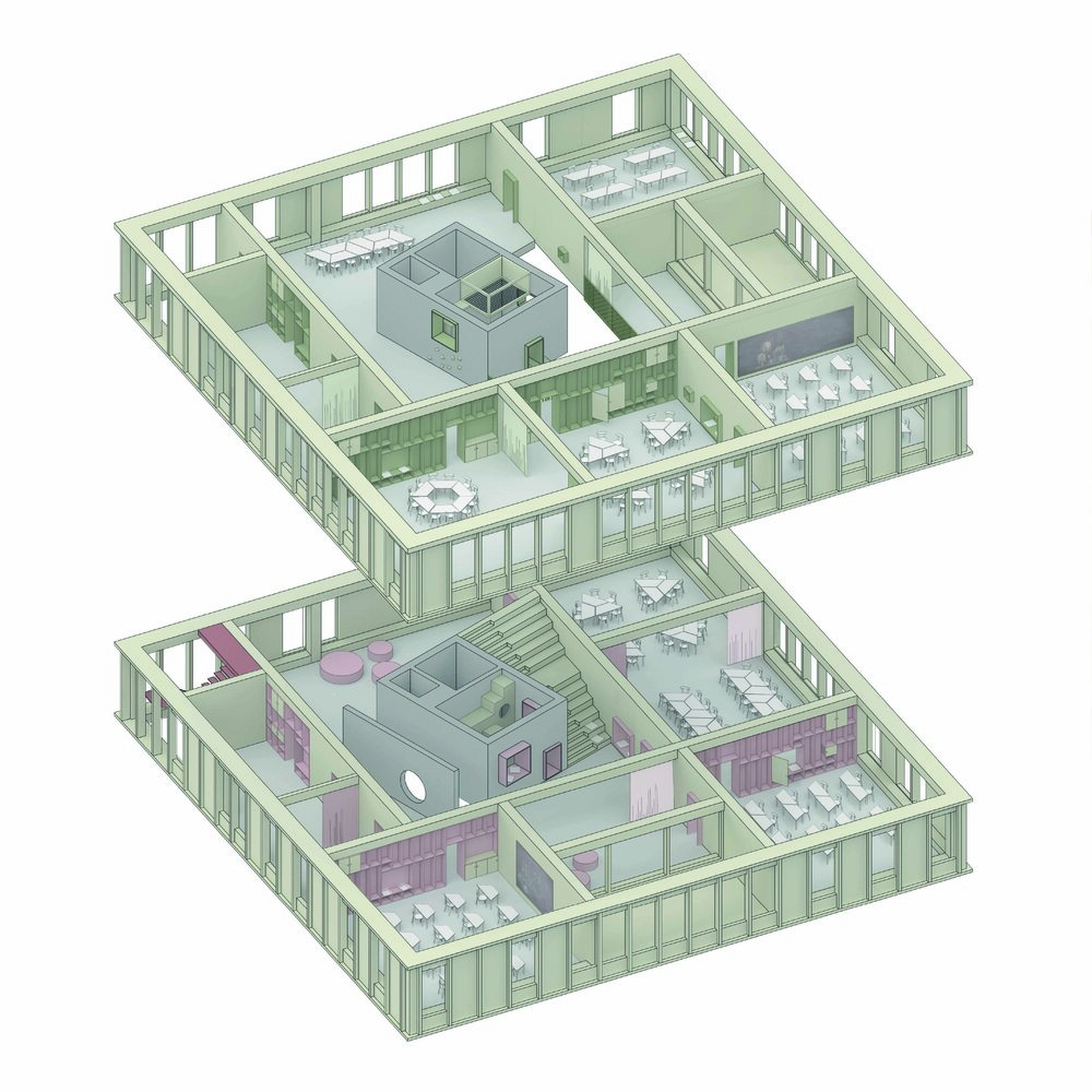 The schoolyard takes the form of an organic reinforced concrete sculpture on a raised level. Only a narrow strip is visible at street level, hugging the two cubes. However, upon entering, students experience a playful landscape that also serves as a “bridge” between the school and the community center. Structurally, a hybrid construction emerges, consisting of a reinforced concrete “table” supporting a wooden structure. Concrete cores inside provide additional reinforcement. The classrooms are arranged in clusters by year, with each cluster having four large classrooms, an open learning area, and a loggia. Two grade levels share a common “experience staircase.”