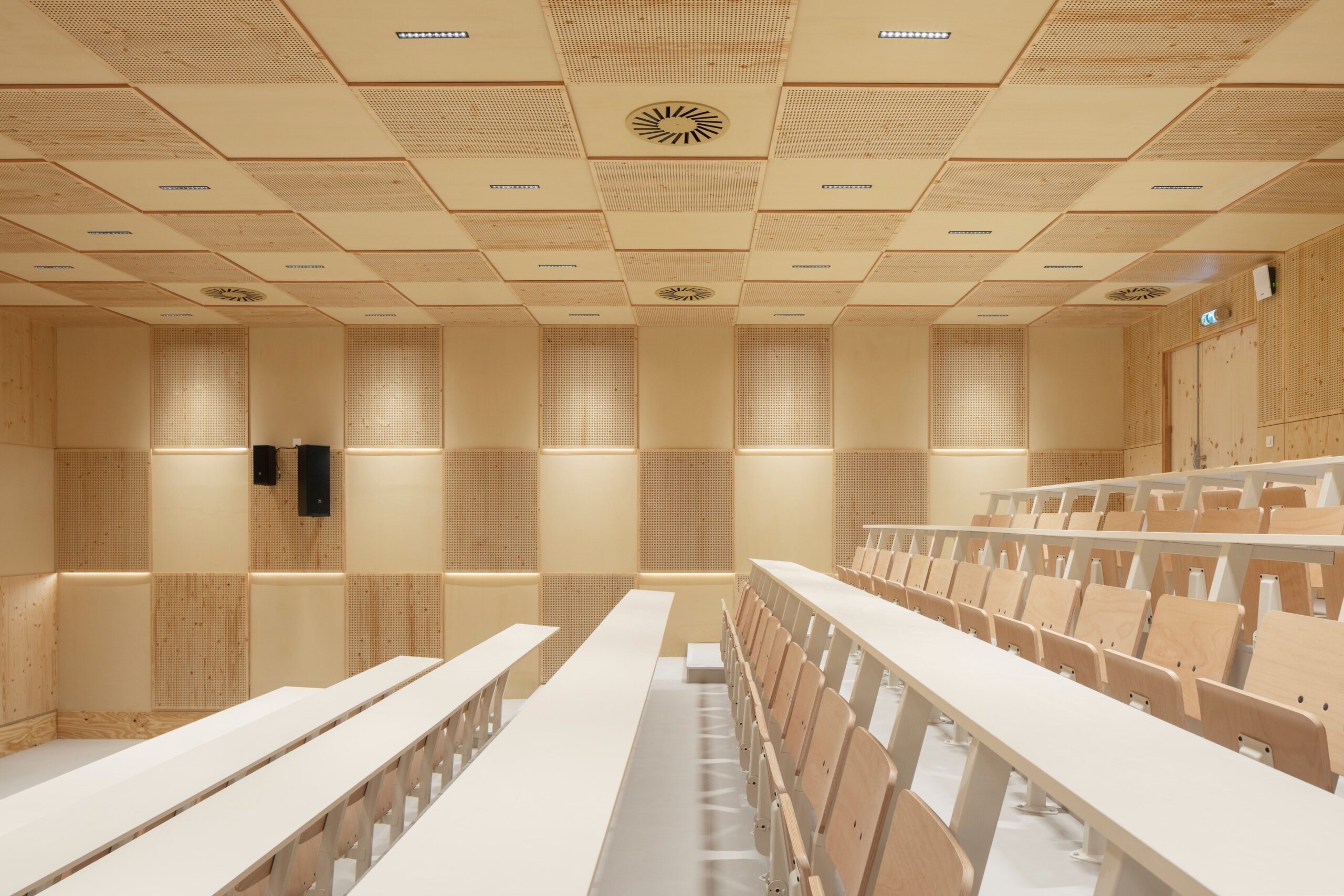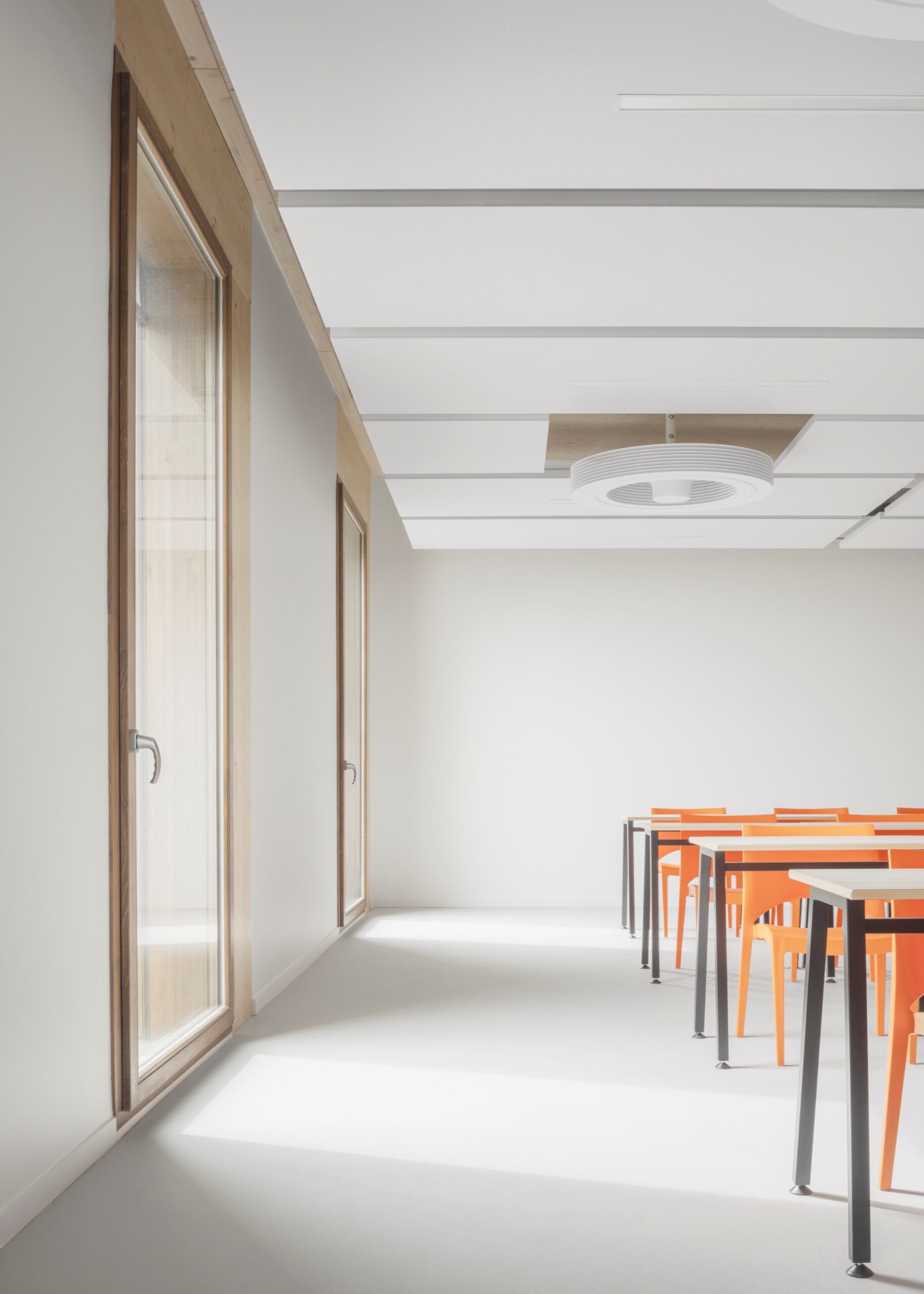 The building’s post-and-beam structural system allows for a high degree of flexibility and transformation. Lightweight, removable partitions make it possible to easily adapt spaces to evolving educational needs, supporting a forward-thinking approach to learning environments.