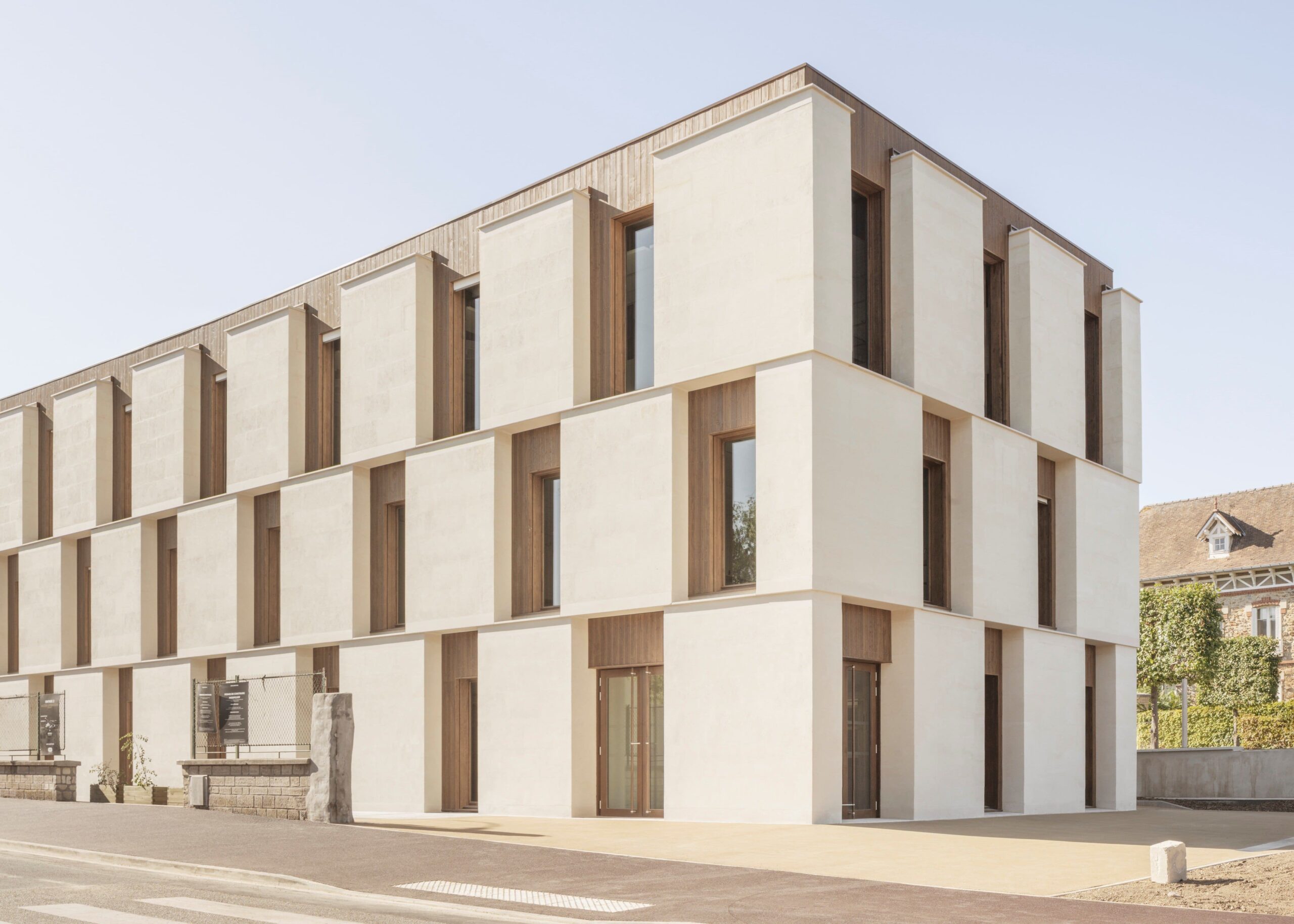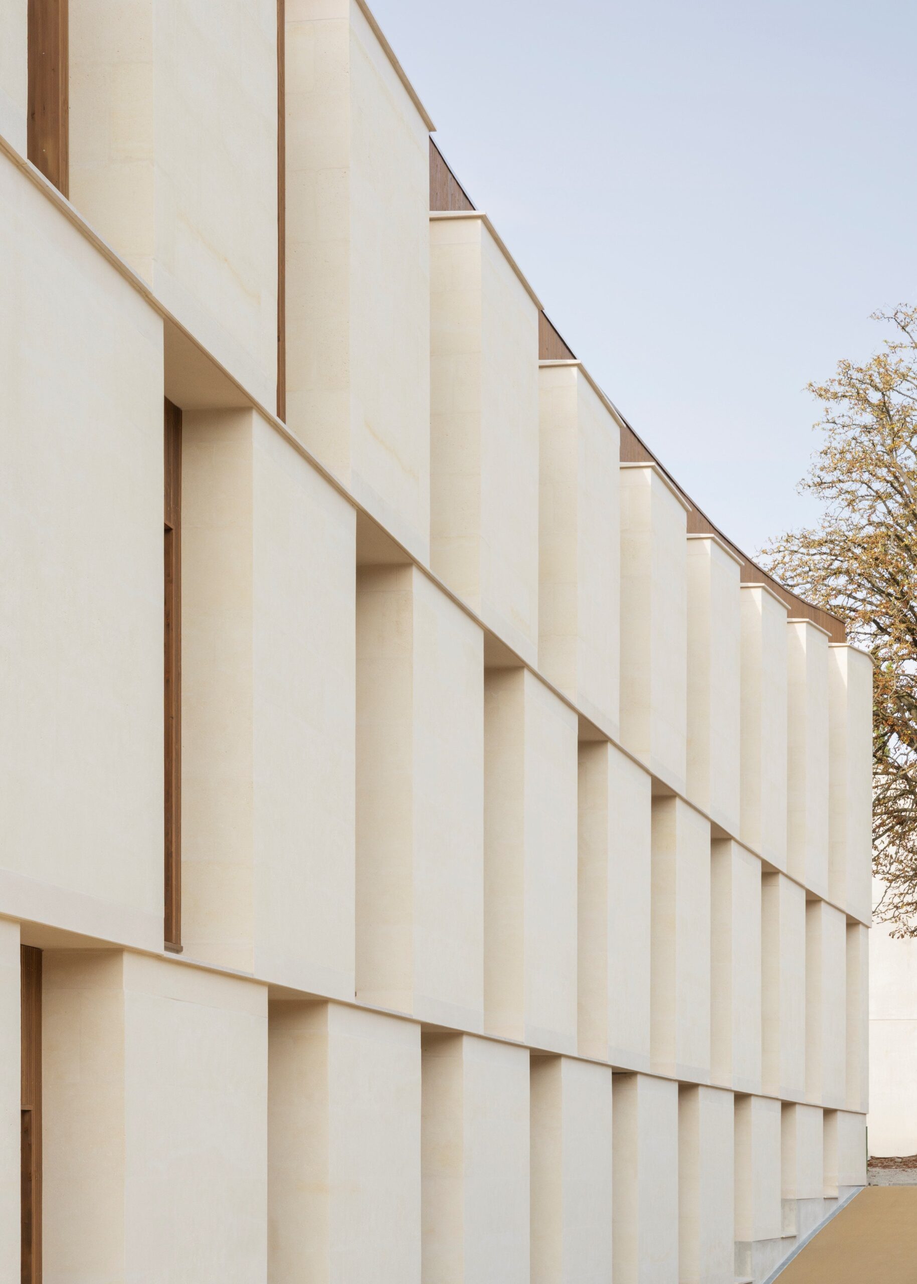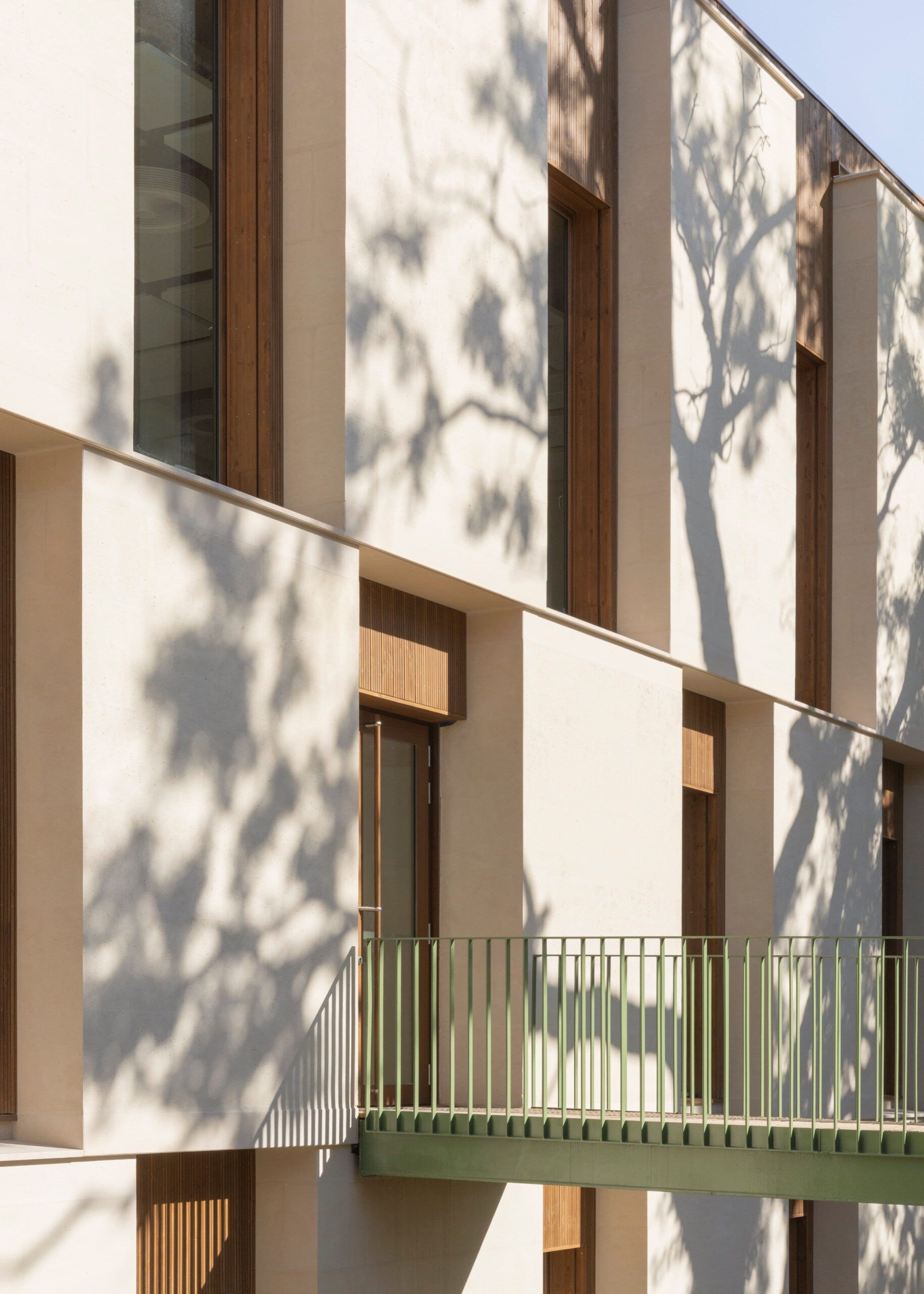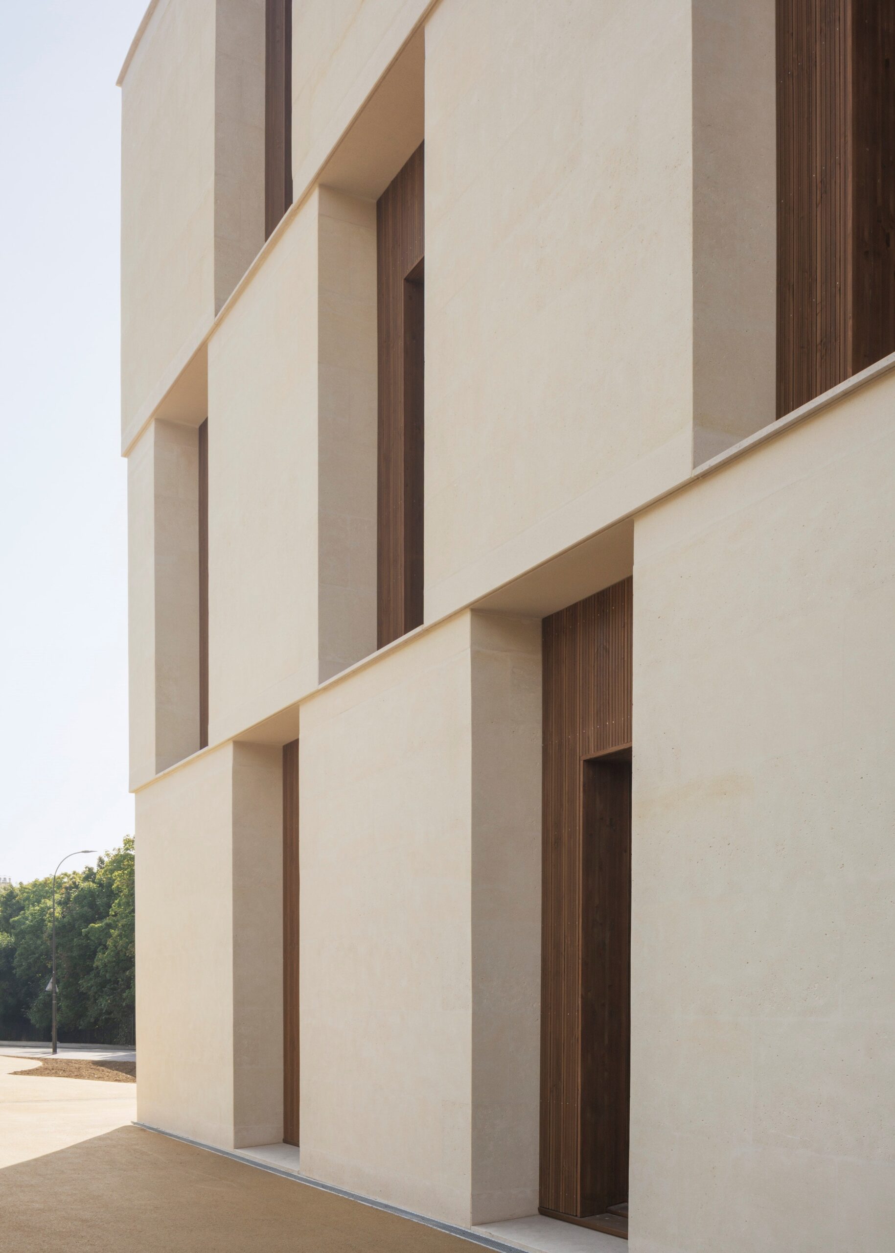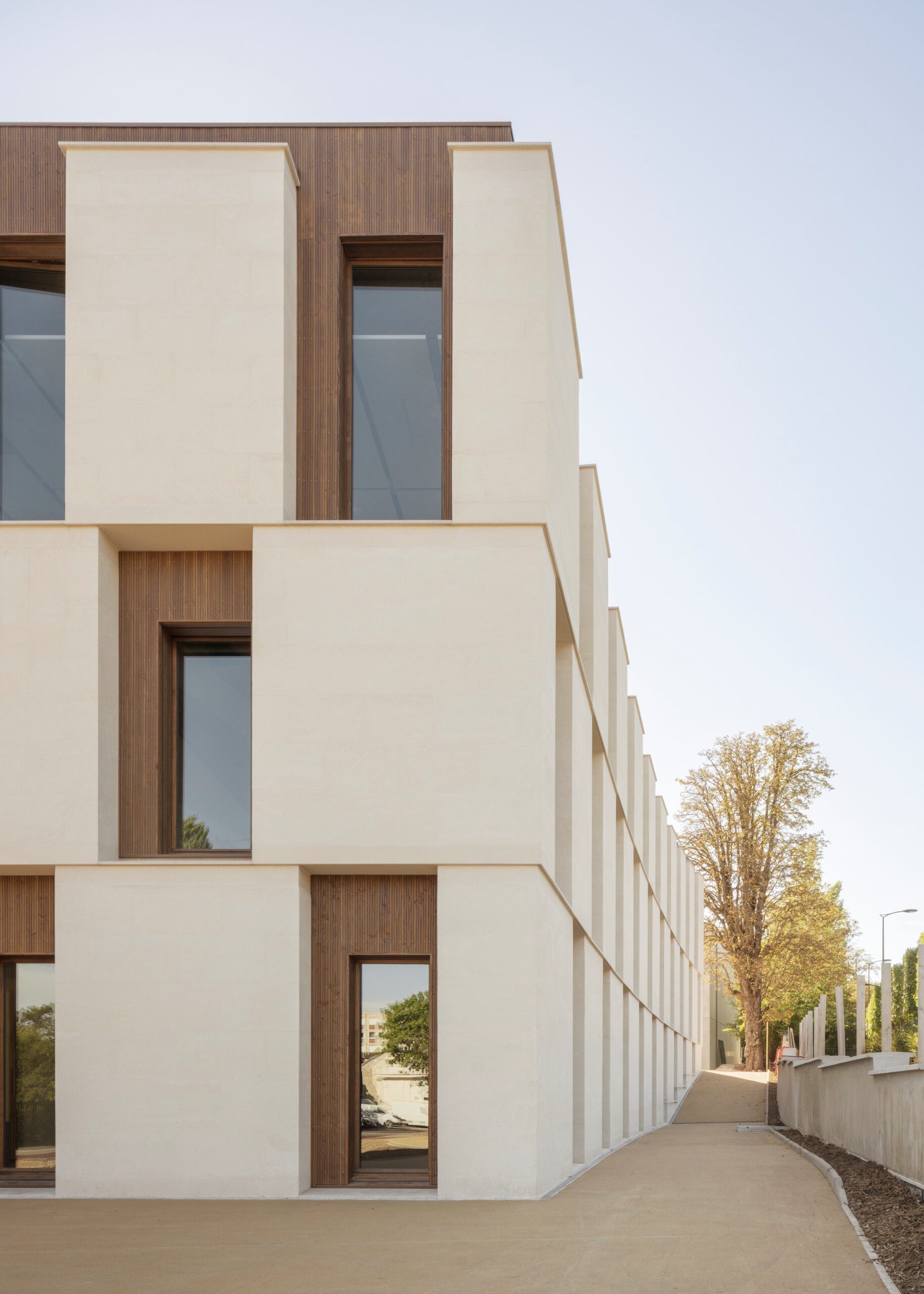 Each façade has been designed with equal consideration, characterized by a rhythmic interplay of stone panels and wooden-framed windows. This alternating pattern of transparency and solidity creates a visual balance between materiality and light. The use of a modular grid system ensures architectural coherence and efficiency, while subtle variations in depth add richness and movement to the elevations.