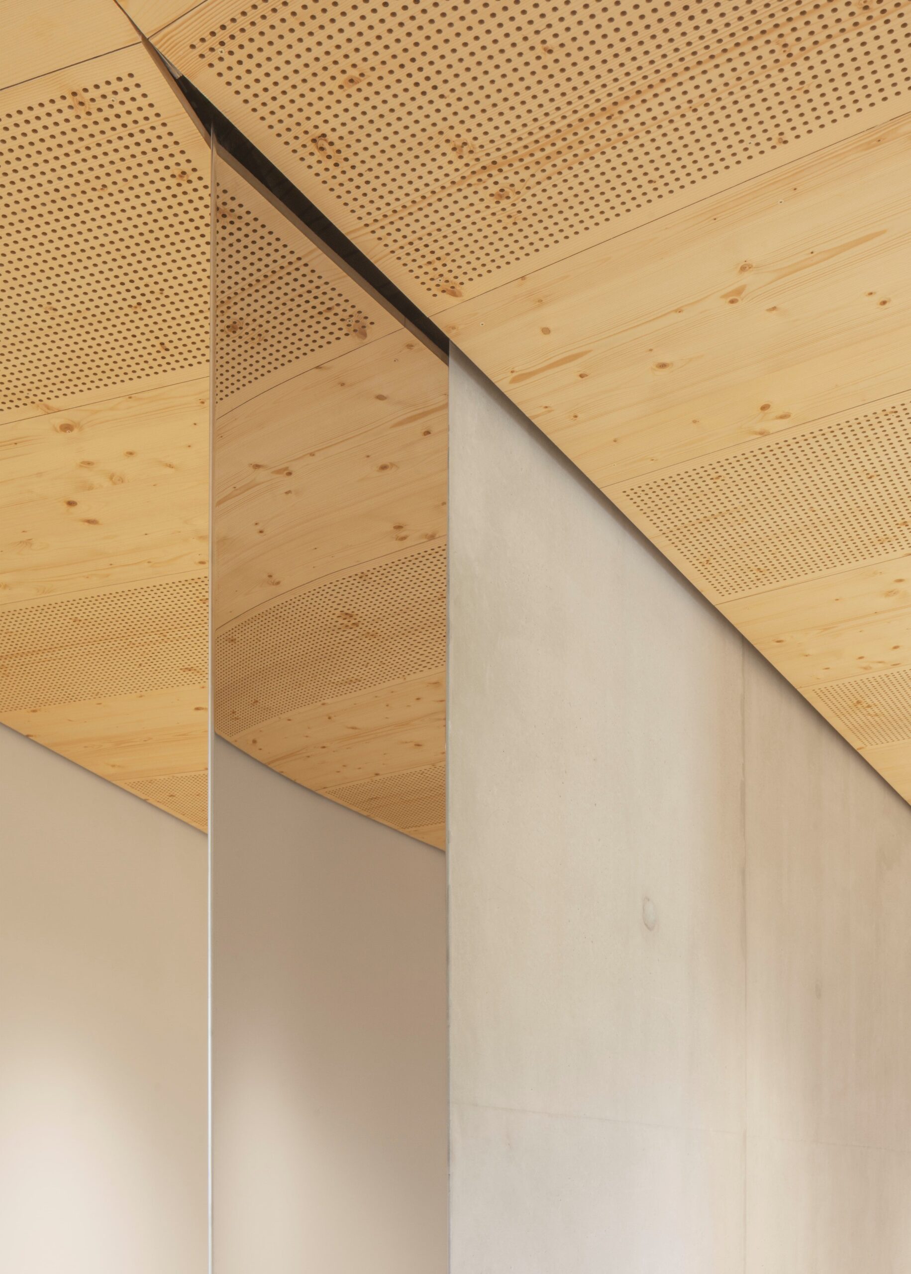 Locally sourced massive stone clads the façade, referencing regional landmarks and reinforcing the building’s strong connection to its territory.