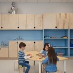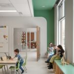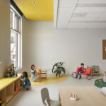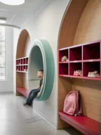 Situated in a neighborhood where the original school building has long served the community, the project prioritizes continuity and integration. The expansion introduces five new preschool classrooms, a learning hub, and a new entrance hall leading directly to the schoolyard, fostering a sense of arrival and openness. The architects carefully considered how to connect the new extension with the existing building while maintaining a coherent flow throughout the campus. From the main hall, students and staff can seamlessly access the learning hub, centralizing the educational activities at the heart of the project and establishing a nucleus for both academic and social interaction.