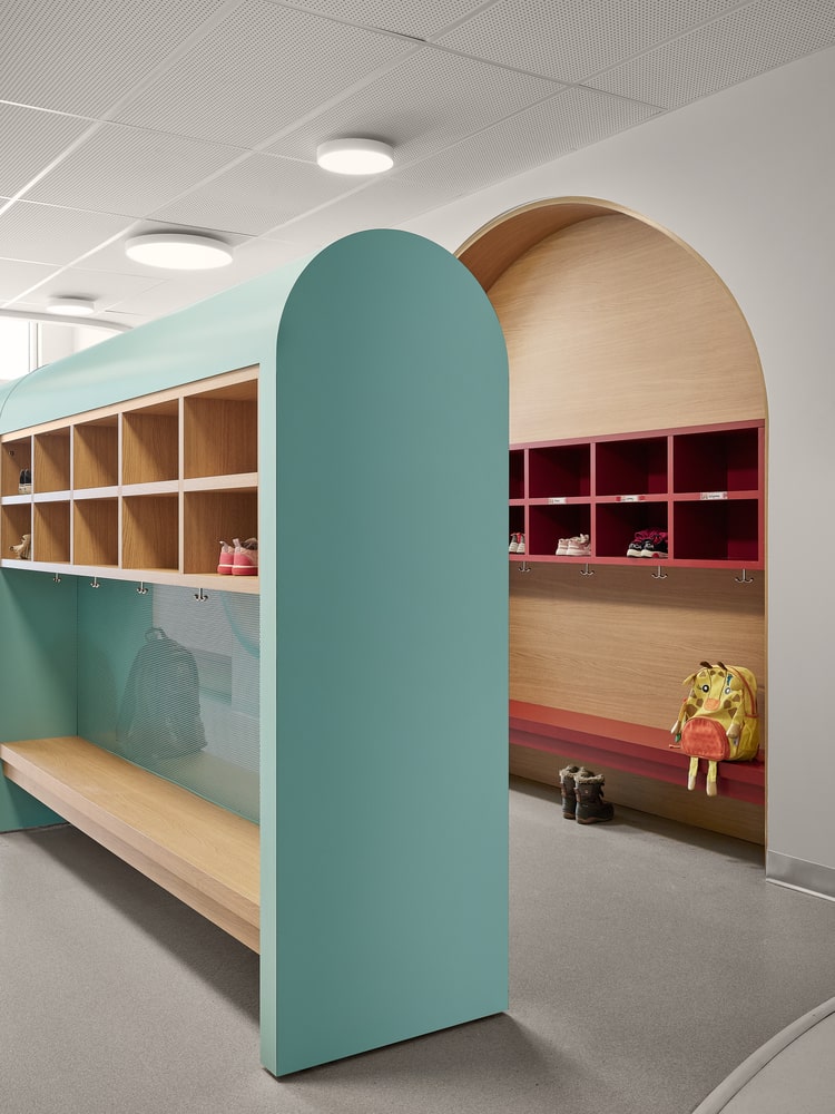 Curved forms are a defining feature of the project, reflected throughout the design of both interior and exterior spaces. These soft, rounded shapes respond to the gentle contours of the local landscape and introduce a sense of movement and dynamism to the architecture. In addition to enhancing aesthetic appeal, the curves contribute to the creation of welcoming, approachable spaces that encourage exploration and interaction, supporting the school’s pedagogical goals.