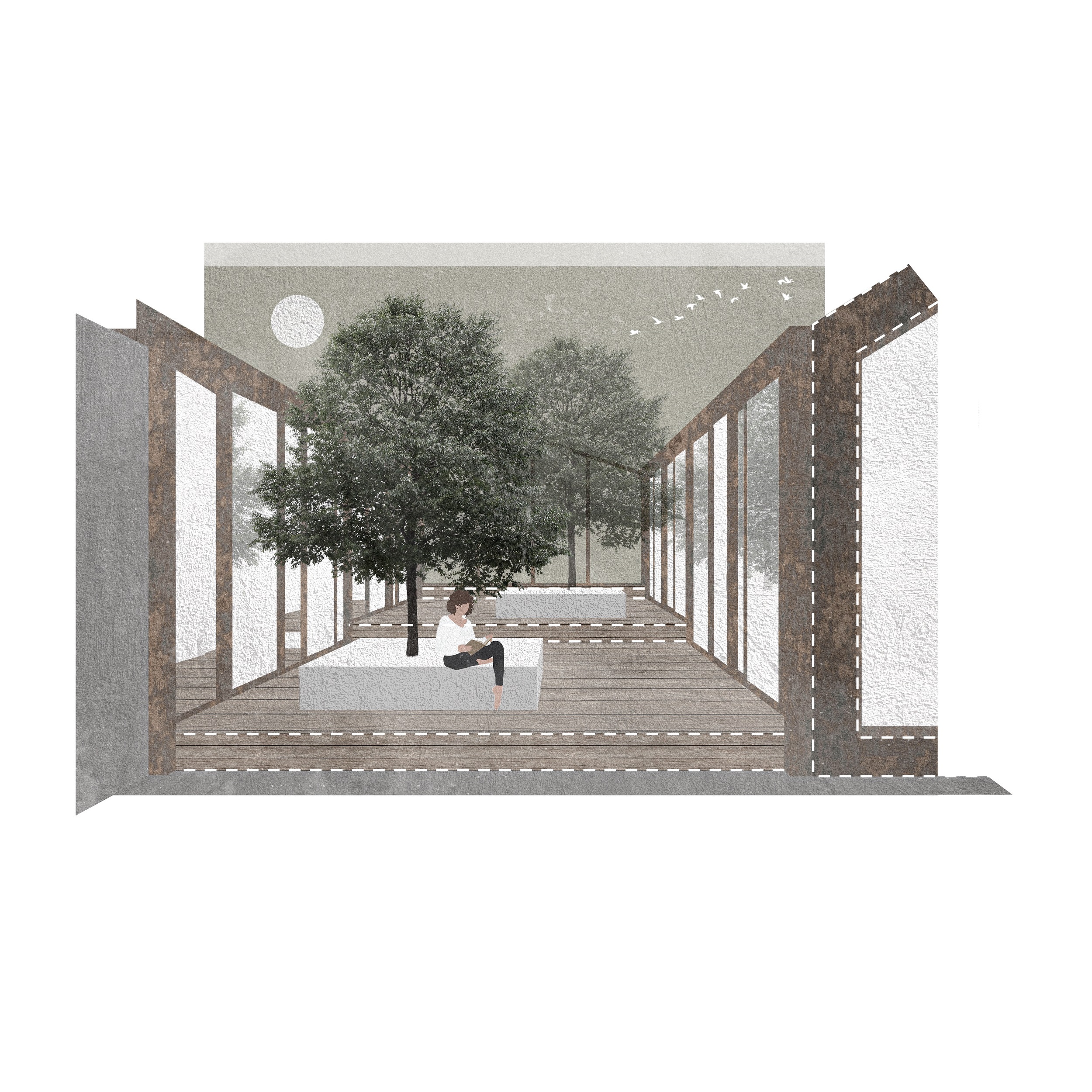 The structure of the buildings consists of wooden frames which are stiffened by a wood construction and isolated in between these construction frames. In the second collage the space between the two buildings is represented, and how the height levels of the structure create a interesting atmosphere, where sitting options and trees make this inner courtyard a fantastic place for communication and get togethers.