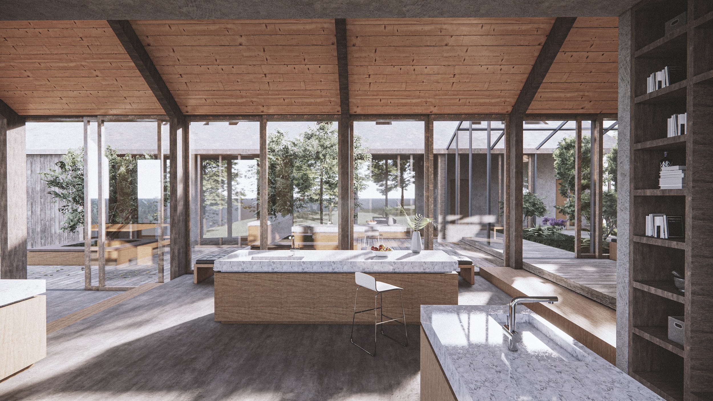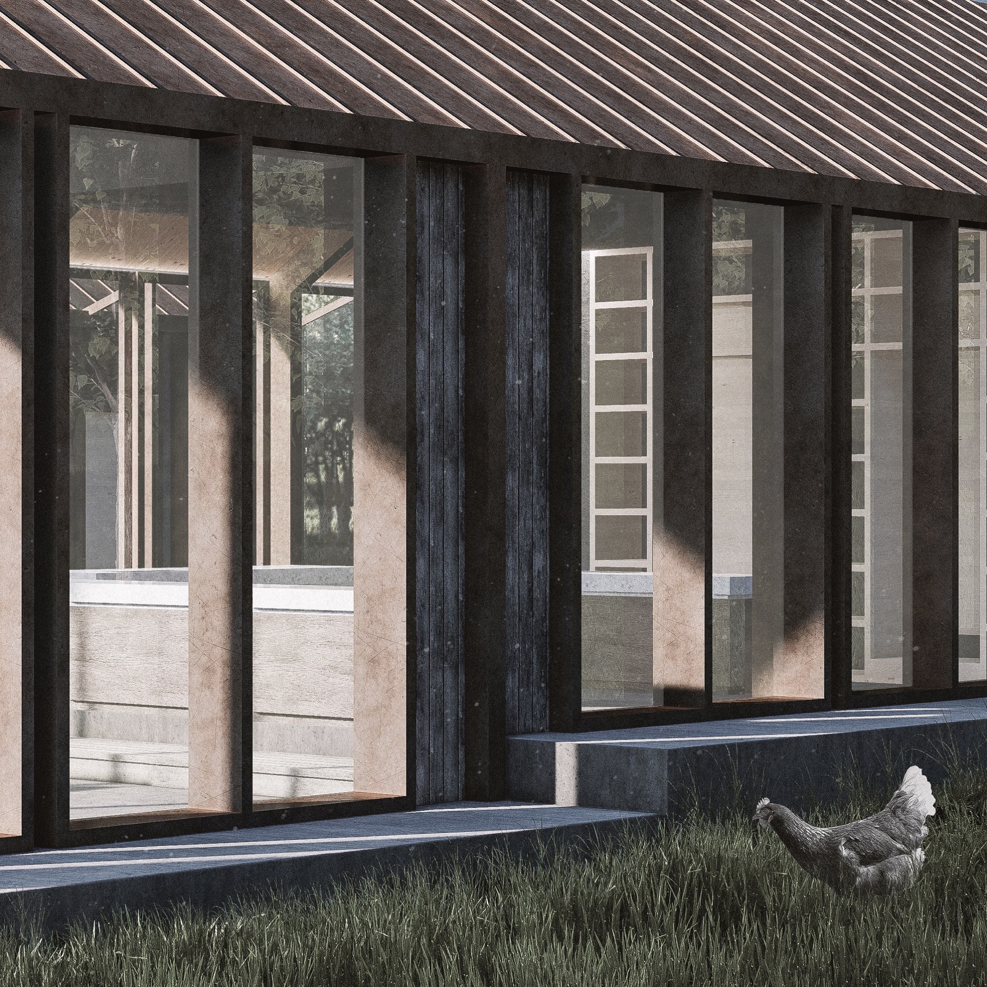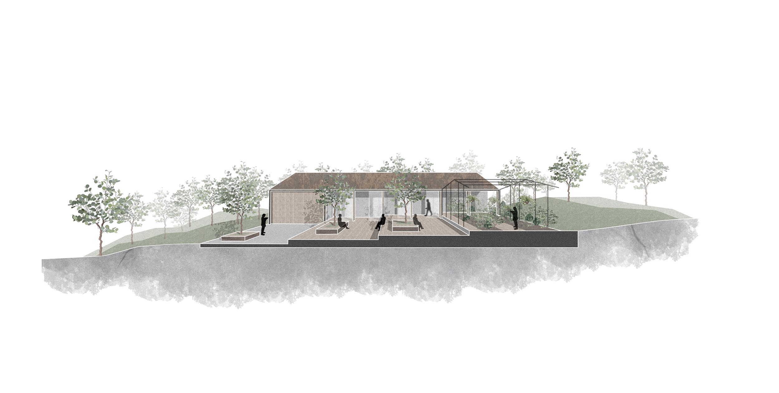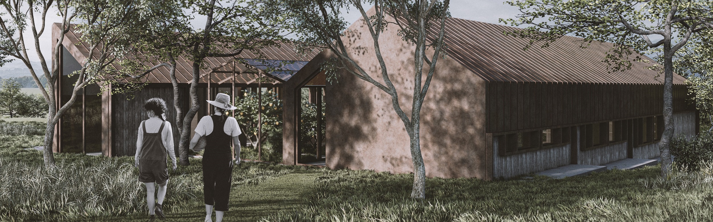 Due to the step-by-step arrangement of the pedestal, the individual functions are divided into different levels in the buildings and used accordingly. The two buildings are connected via the courtyard, which was created by the positioning of the buildings and is not only an access function but also a space for relaxation, meeting people and communication. Another possibility for connecting the houses is the glasshouse, which is a greenhouse where local vegetables and fruits as well as herbs can be grown.
