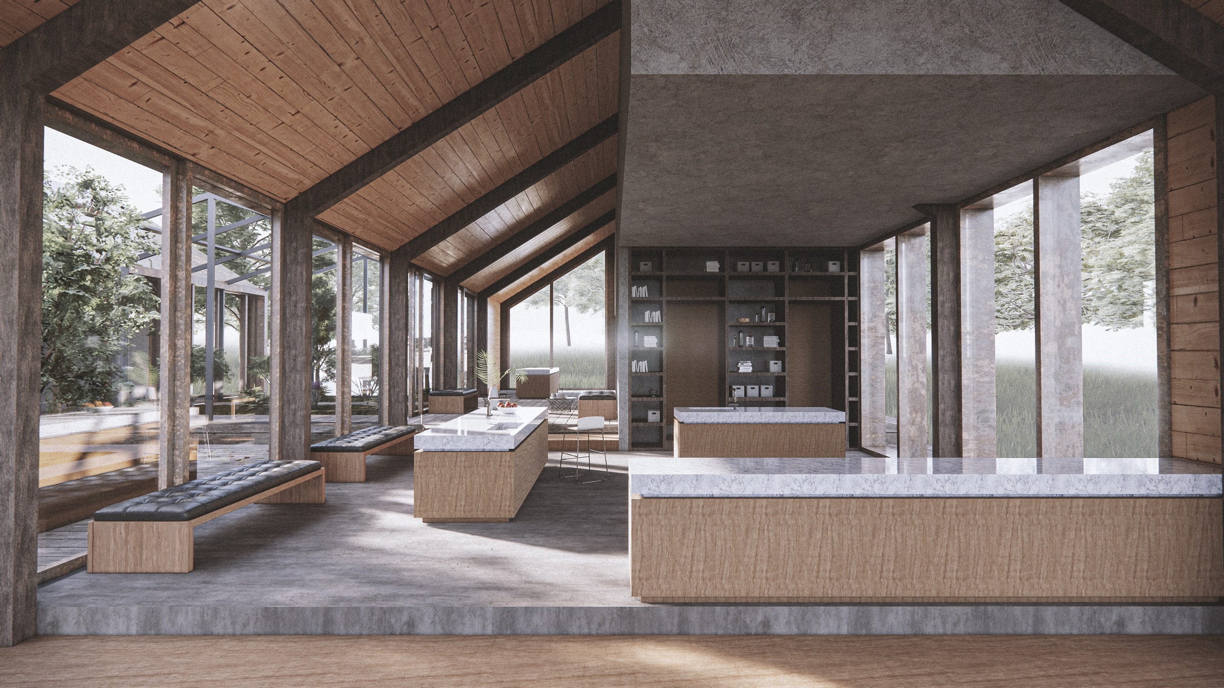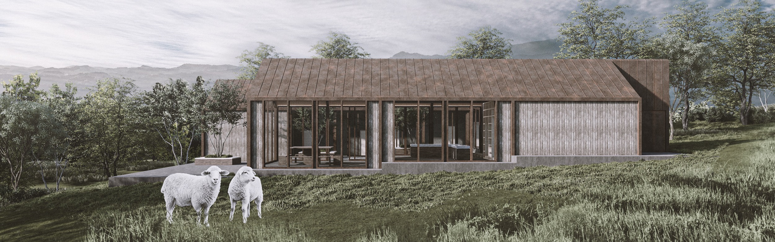 The facade consists of a vertical wooden facade on the one hand and a bronzed bronze folded roof membrane on the other hand, which pass into bronze frame elements that work for water drainage and for the integration of the window frames. I wanted the building complex to develop the same way as the landscape does. The room for eating and cooking should be a big open space with a lot of relationship to the outside and the room in between these two buildings. With the first collage i wanted to show how the complex and its pedestal develops like stairs adapted to the landscape.