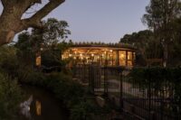 The gentle curve of the building is not arbitrary. Its geometry is derived from the natural meander of the stream that defines the site’s northern boundary, anchoring the architecture to its landscape context and reinforcing a sense of place.