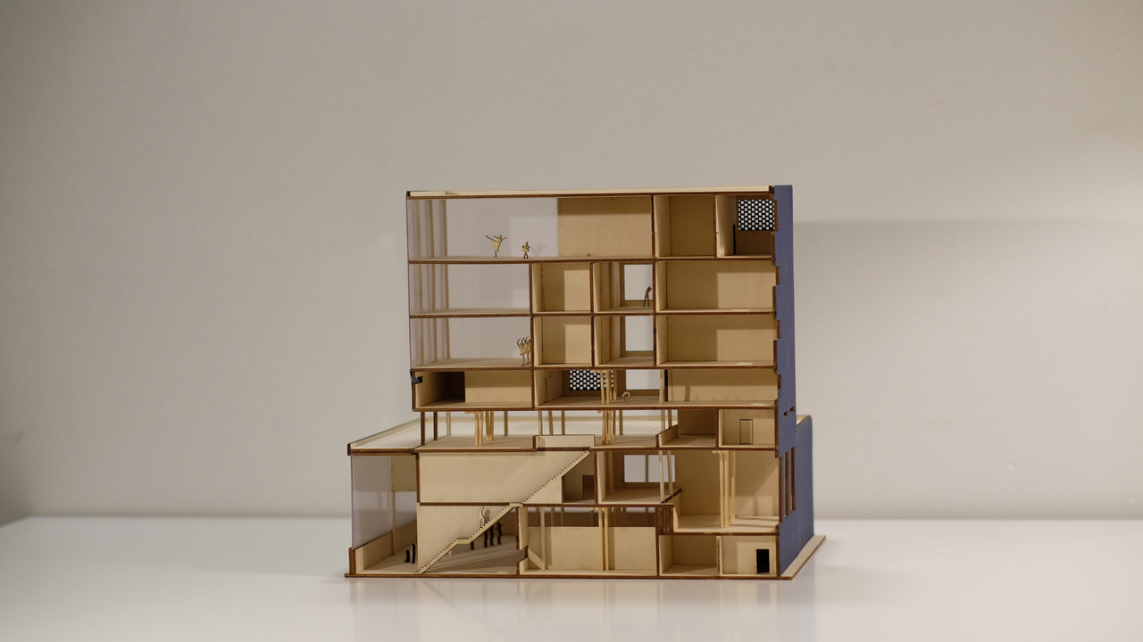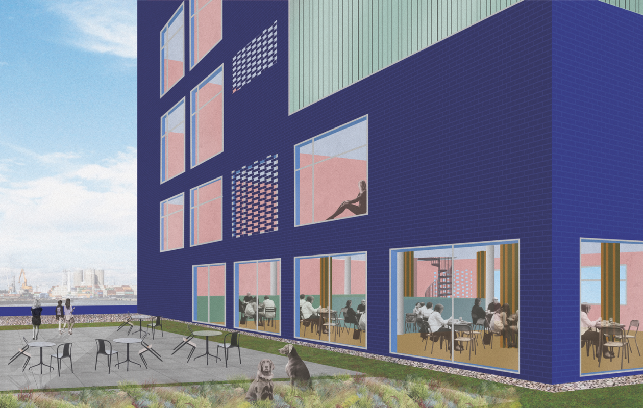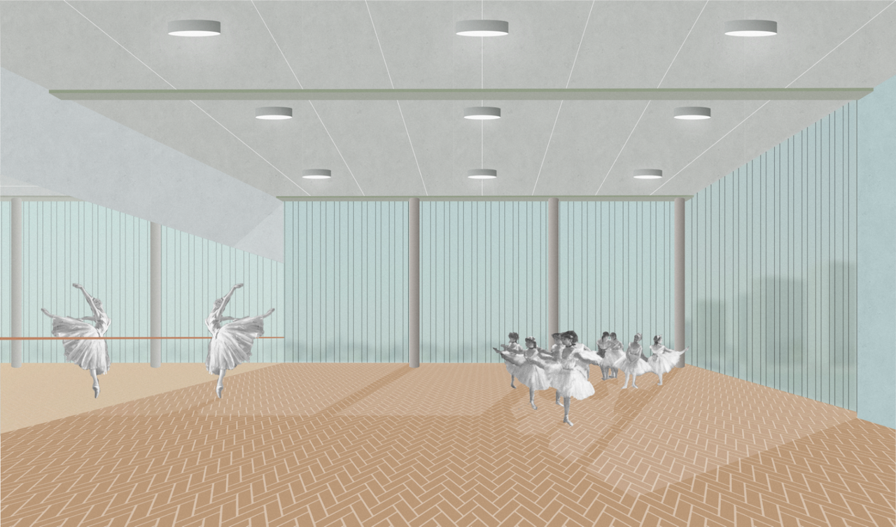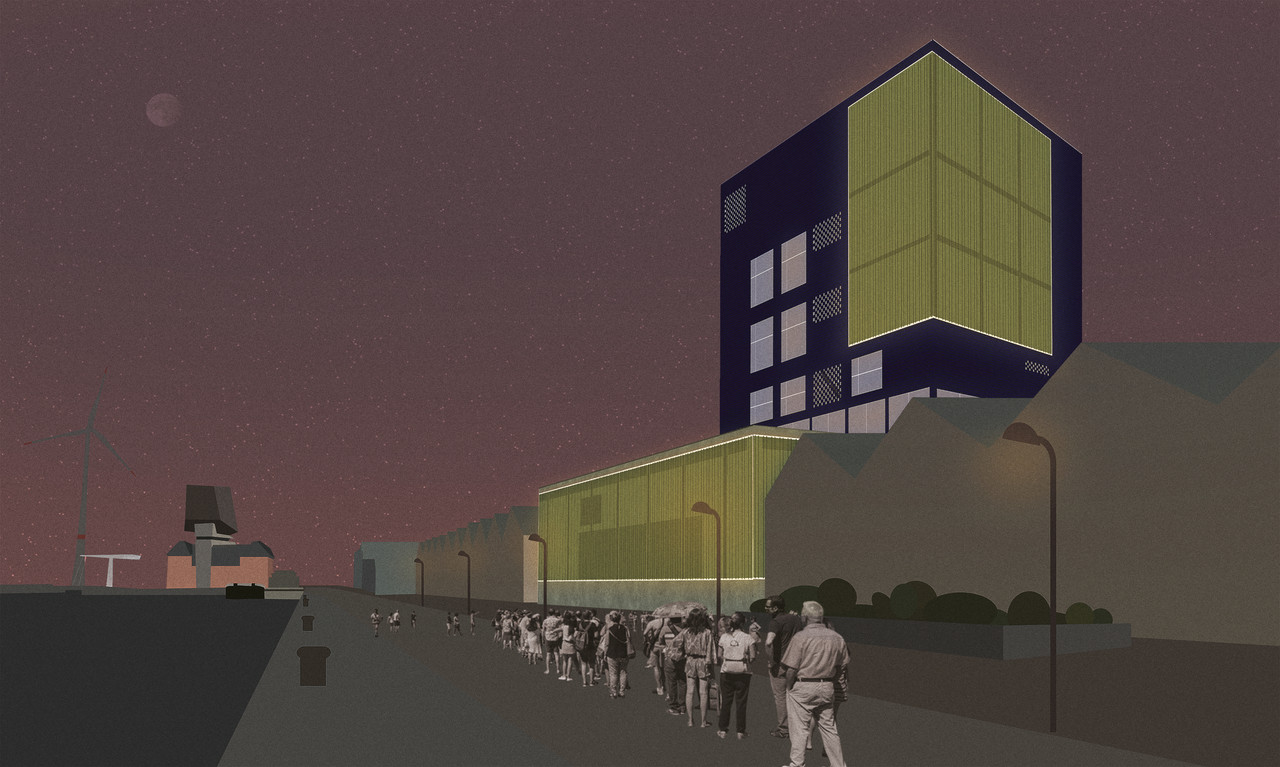 The use of blue, glazed brick in the façades refers to the old bridge guard houses in this area. The channel glass windows shows to the public where the dancing rooms are located in the building, while at night it gives a glimpse of the internal activities of the building.