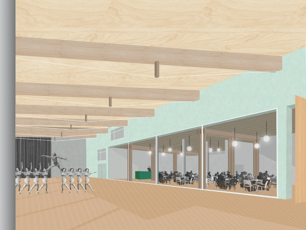 The structure consists out of four steel frames that are supplemented with a secundary wooden structure. Inverted king post trusses allow for a large, open performance hall. The perforated brick wall parts create an interesting contrast between open, closed en semi-closed.
