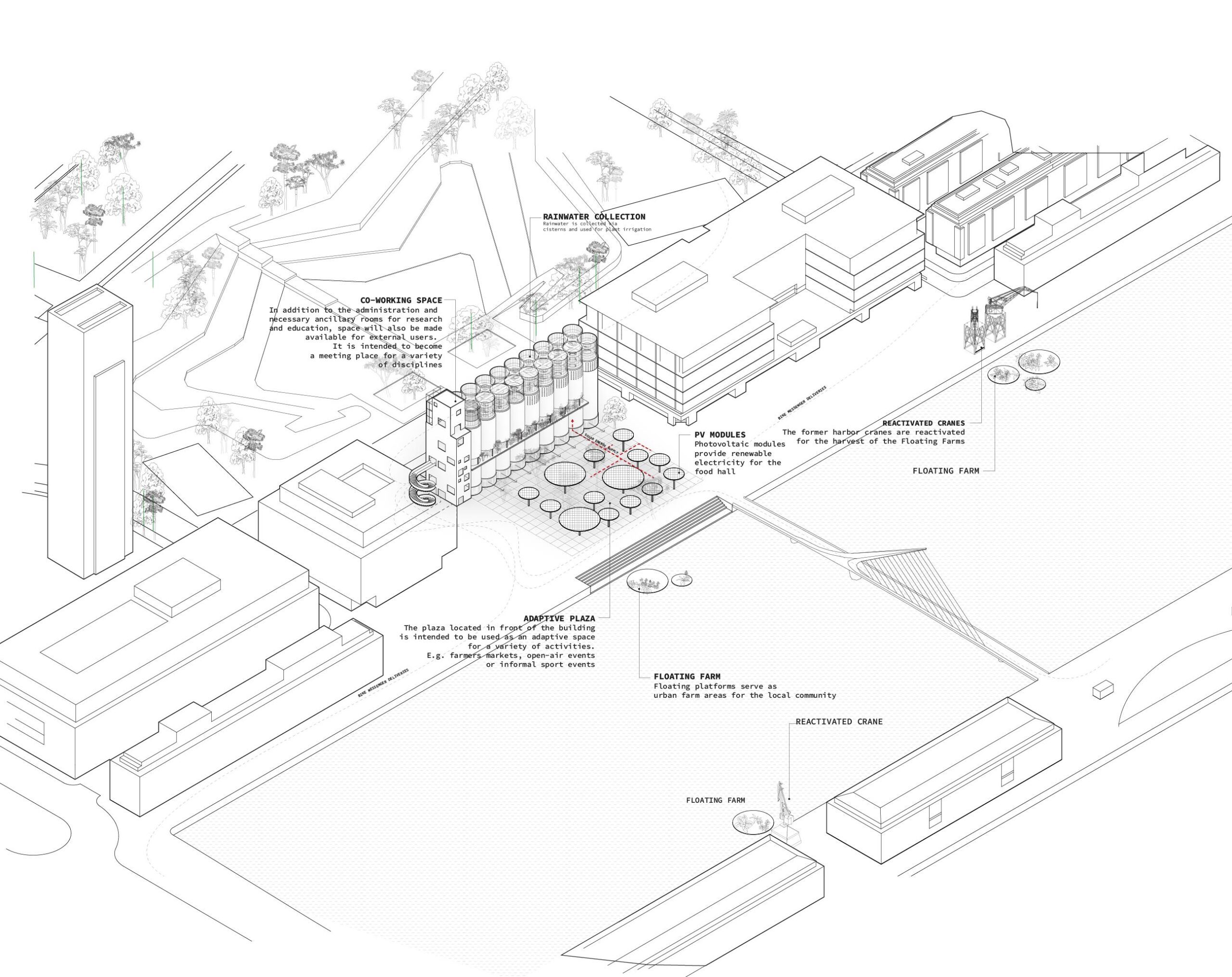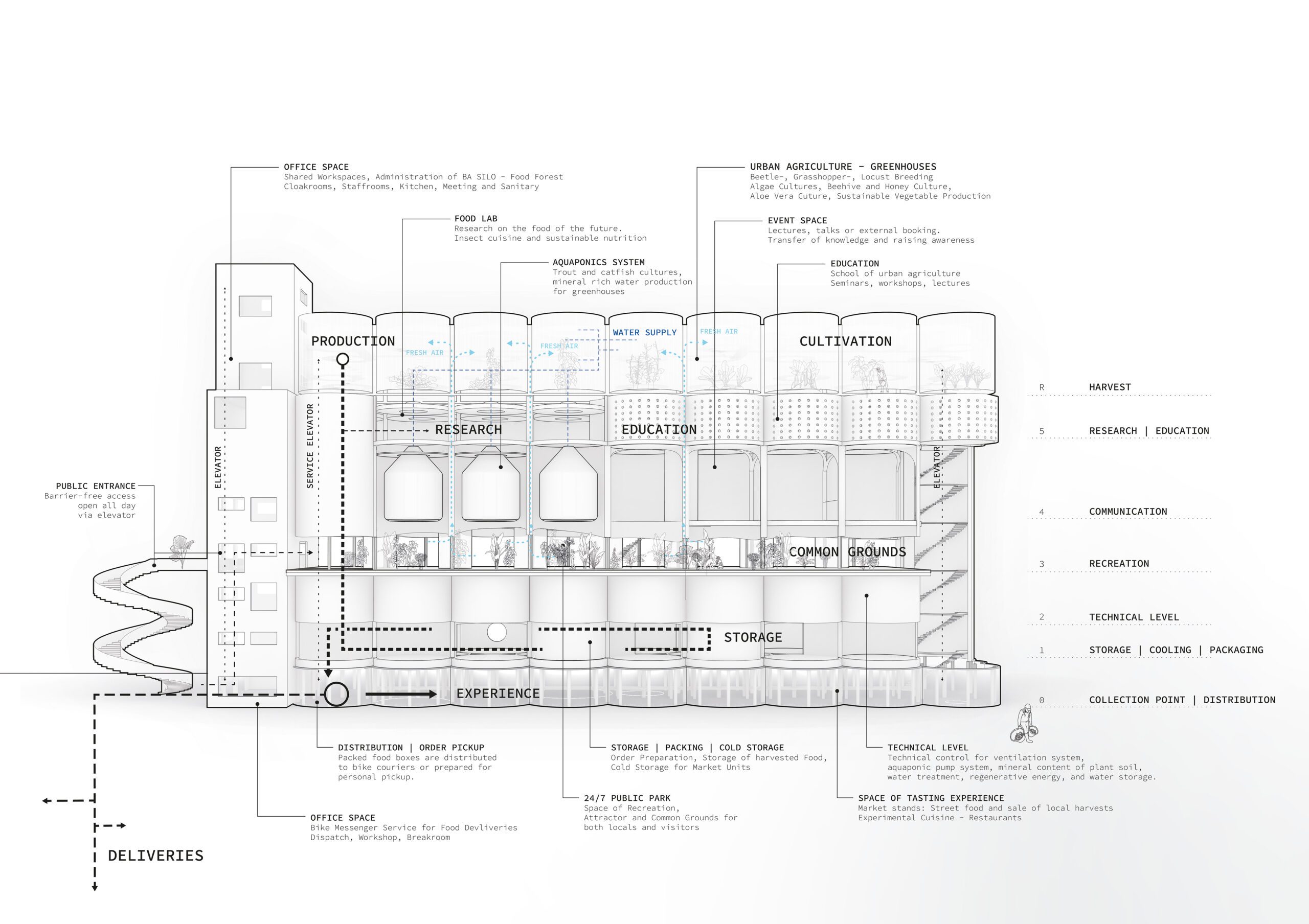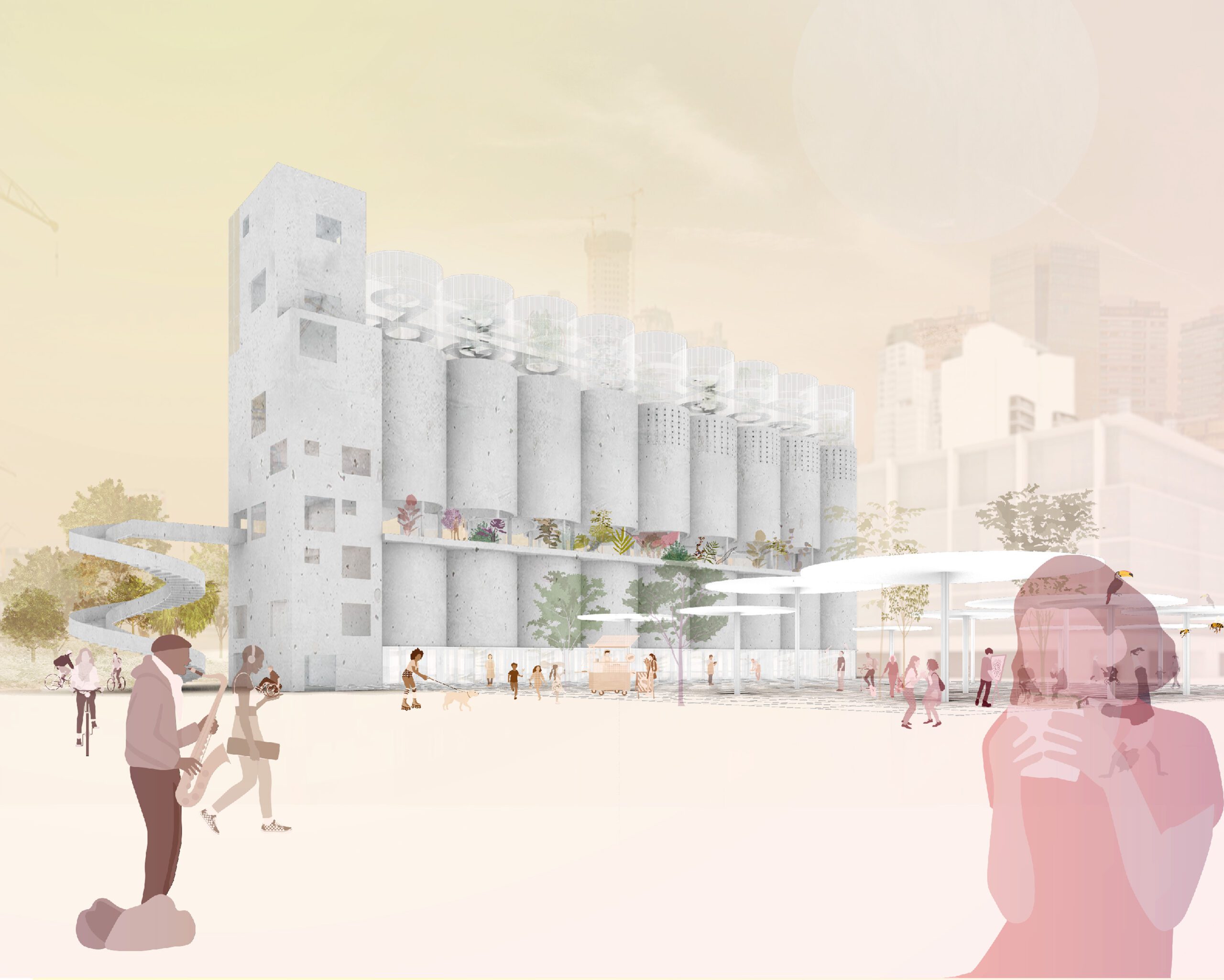 This project deals with the topic of a reuse of abandoned silos in Buenos Aires. Food as a right to the community – Providing healthy, nutritious food for all, regardless of income, is the defined goal of this design. An edible ecosystem is presented to explore alternatives to conventional agriculture, sequester carbon, enhance biodiversity and yield a hundred varieties of foods.