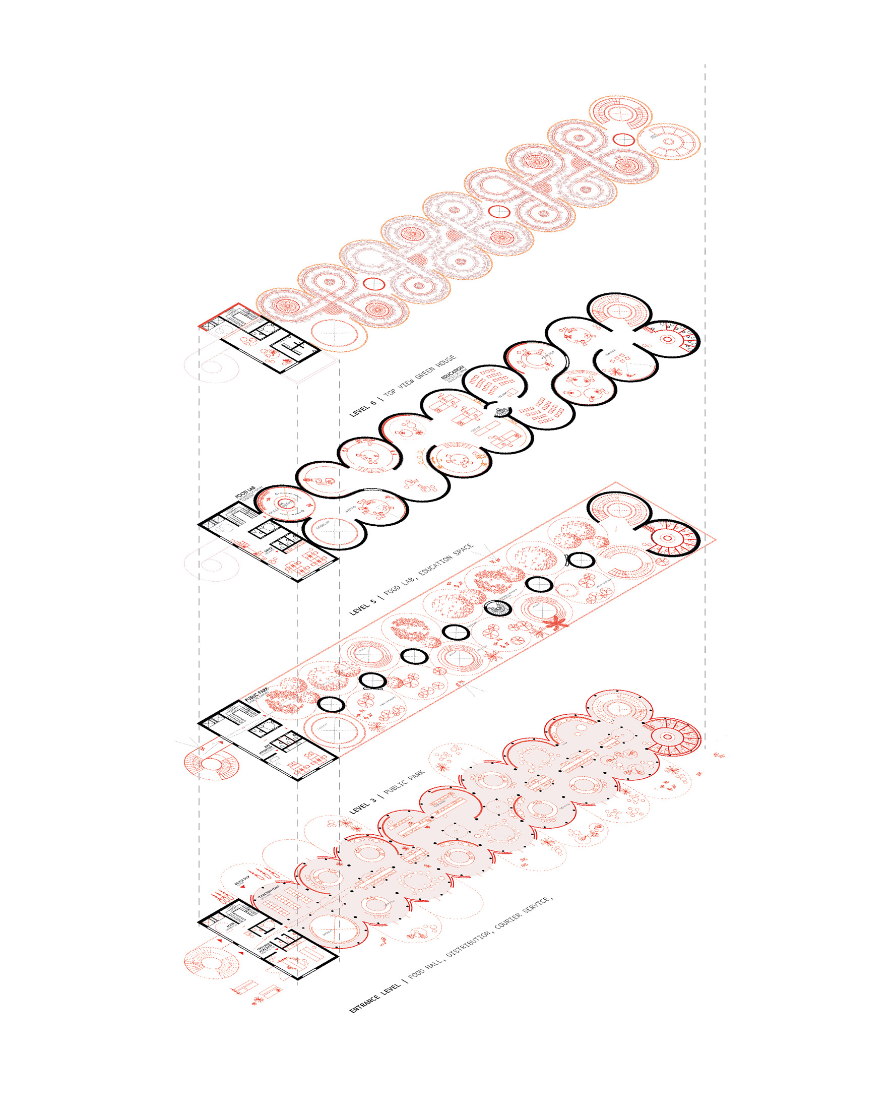 Further, the building houses educational spaces where workshops, seminars and lectures are offered to promote self-growing to the interested public. The program is enriched with a didactic garden within the floating park, which is open to the public.
