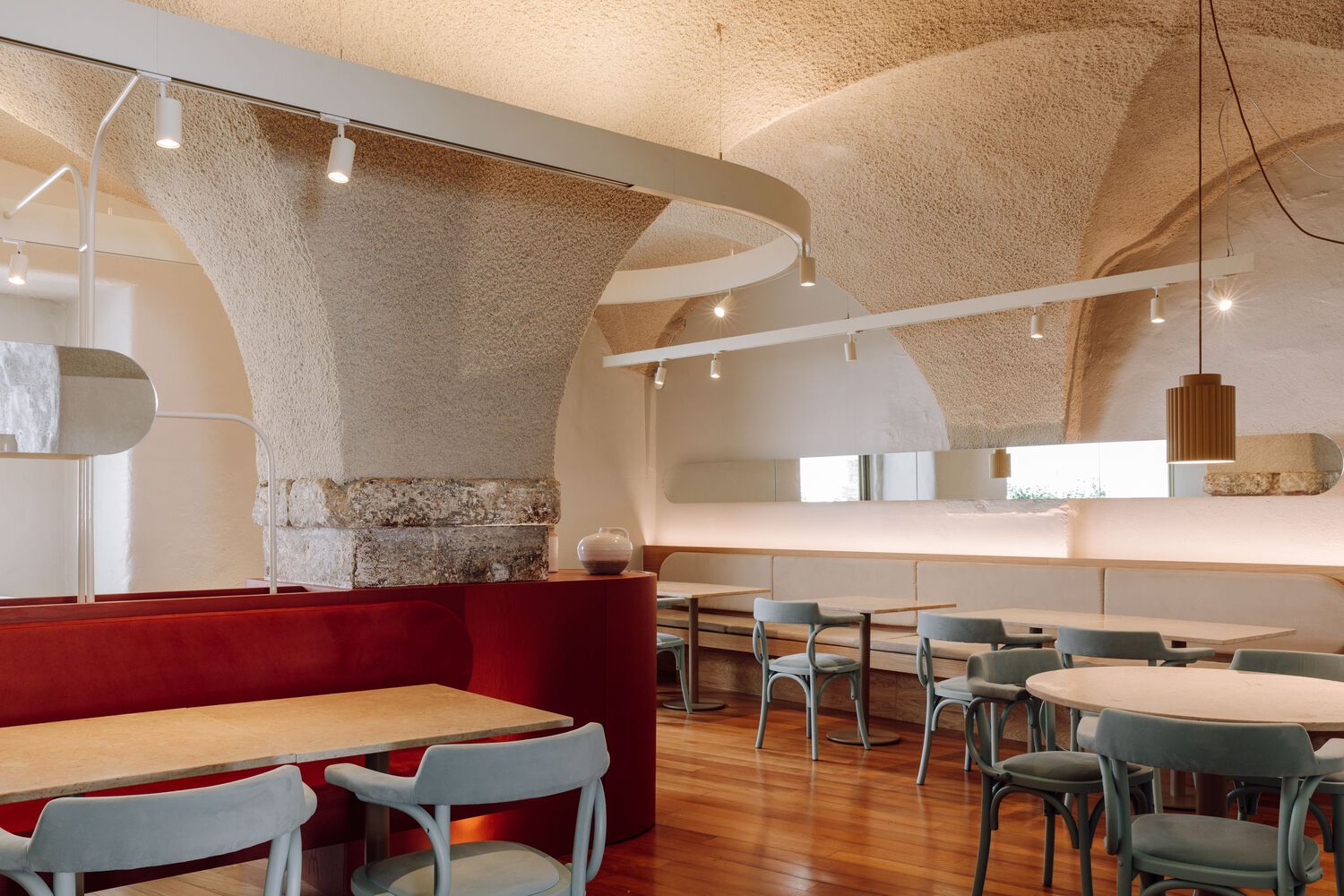 The rear dining room offers a more intimate extension of the communal experience. The layout is anchored by a long terracotta-colored bench that stretches between two existing stone columns. This central element organizes the space, creating a circular flow that links seating areas with the bar counter at one end and an additional bench at the other.