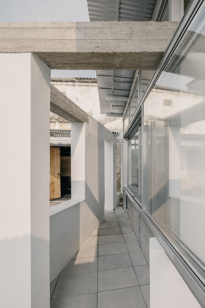 Inside the antique house, interior wall panels and floor slabs were carefully removed to expose the original timber structure, revealing the craftsmanship and materiality of the late Qing dynasty construction. A galvanized steel framework weaves lightly through the rafters, accommodating functional programs including display, seating, and lighting without causing structural damage. The ground is overlaid with black epoxy resin, contrasting smooth, contemporary surfaces against the aged timber and emphasizing the historical layers of the building.
