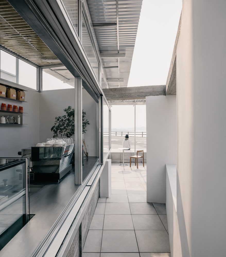 The design of the eaves responds directly to functional and contextual needs, varying in height across four sides. Where the passage intersects with the original kitchen annex, it forms a café window, while the section facing the road lowers to create a welcoming entrance. Adjacent to the neighbor’s wall, the eaves descend further, incorporating an existing tree, before turning toward the main house with a gentle distance that respects its historic façade. These subtle shifts in height create a dynamic rhythm while maintaining harmony with the surrounding environment.