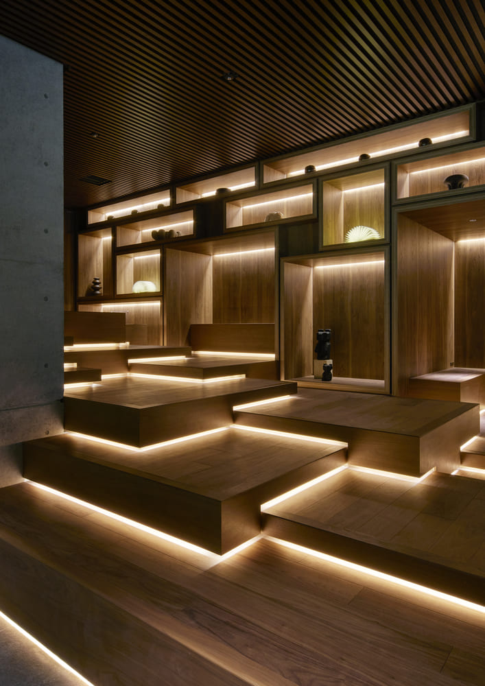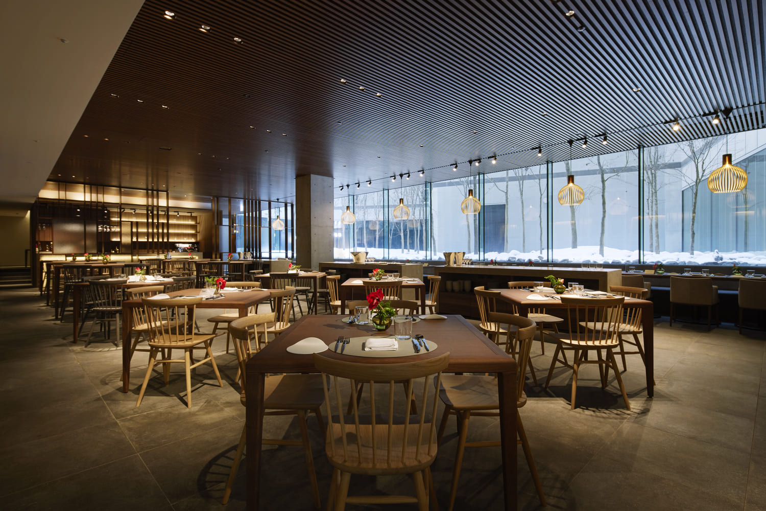MUWA NISEKO is organized around a central courtyard, the “Four Seasons Garden” (shiki-no-niwa), which serves as the heart of the complex. This courtyard incorporates native Japanese maple trees and rocks excavated on site, creating a dynamic landscape that evolves throughout the seasons. Surrounding the courtyard are guest rooms, common areas, reception, restaurant, spa, and hot spring facilities. By arranging the building in a square form around the courtyard, the design maximizes natural light penetration to the basement and lower floors while enhancing visual and physical connectivity between spaces.