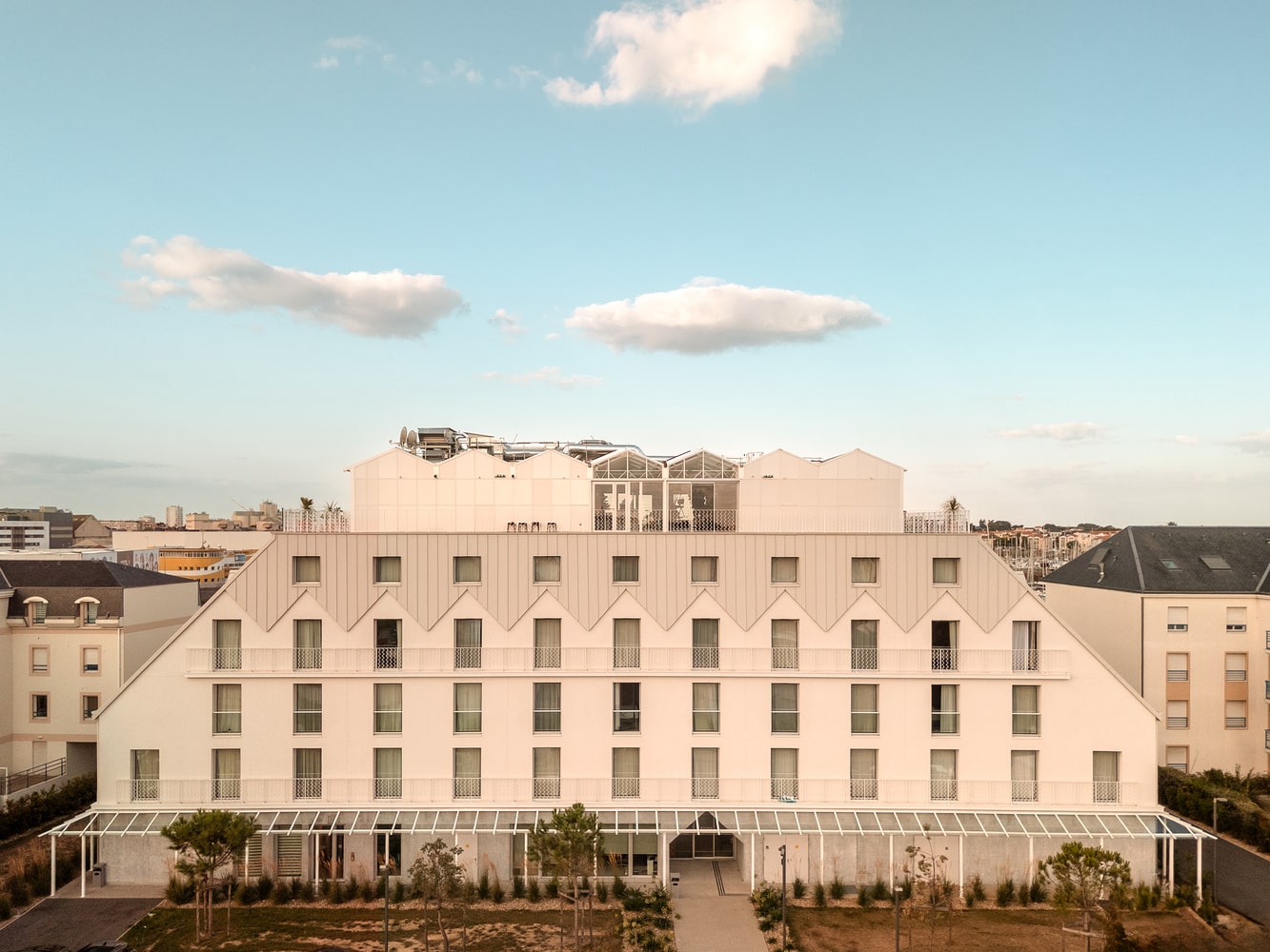 Vertime Hotel is conceived as a multifaceted destination that seamlessly blends hospitality, leisure, and domesticity. More than a conventional hotel, it functions as a hotel, bar, restaurant, pool, workspace, meeting place, and living space, embodying the essence of a grand seaside villa. Designed by Block Architectes, Vertime offers a warm, family-oriented spirit that balances the demands of modern hospitality with the traditions of French seaside architecture. The project is situated at a key urban threshold: the entrance to Les Sables d’Olonne on a busy boulevard, adjacent to the Olonna marina and the Vendée Globe pontoon. This location posed both challenges and opportunities, requiring a strong visual and spatial connection to the port while mitigating the noise and intensity of the thoroughfare.