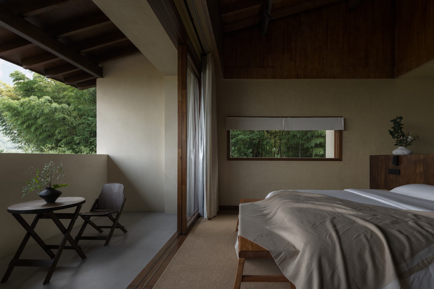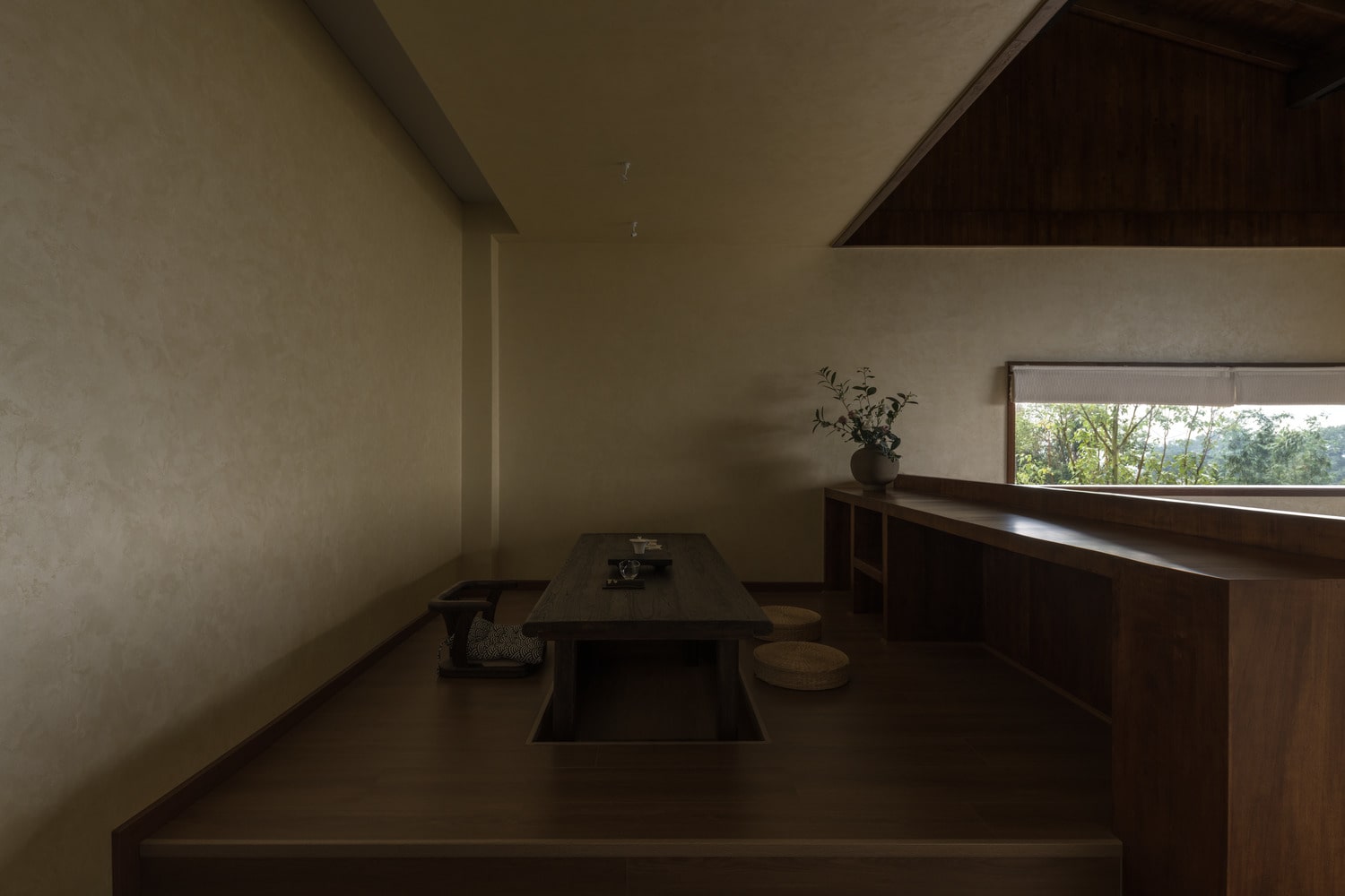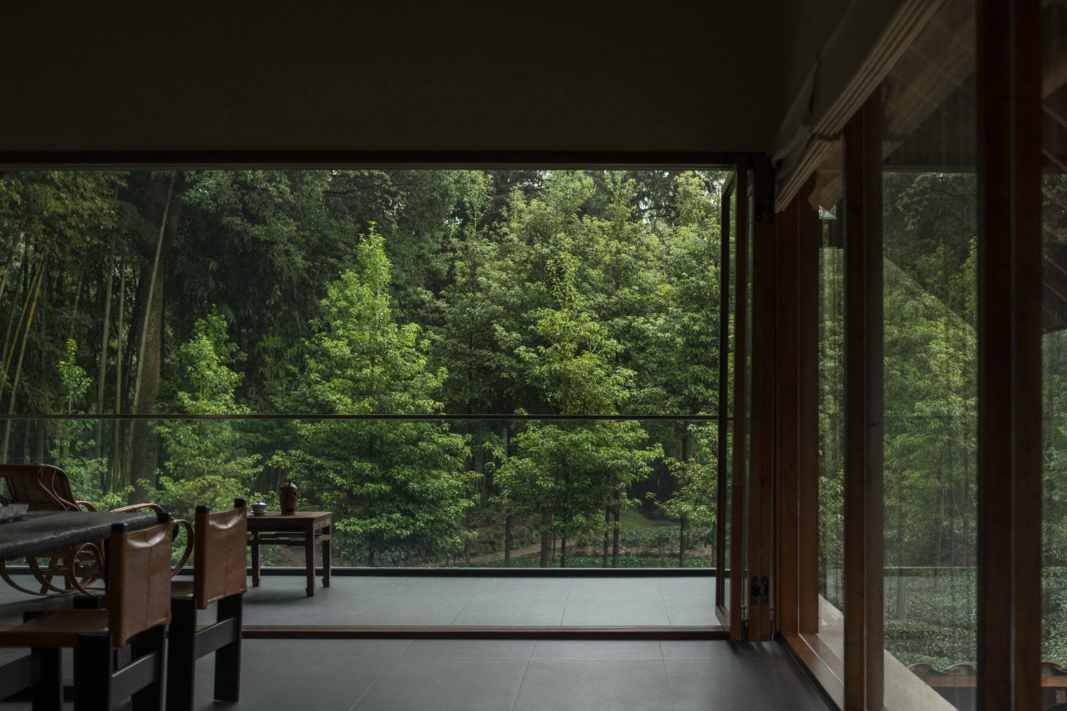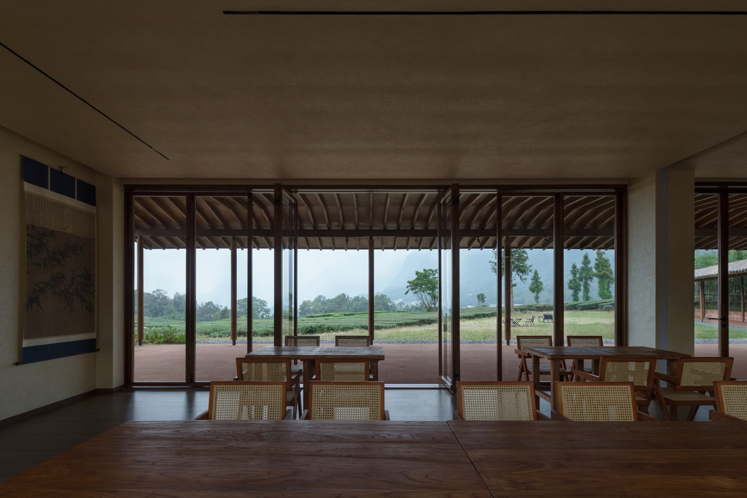 Floor-to-ceiling windows frame dynamic views of the surrounding tea fields and mountains, blurring the boundaries between indoor and outdoor life. The furniture is handcrafted, emphasizing texture and form over ornamentation. Each corner tells a quiet story through light, material, and proportion. Rather than relying on decoration, the design captures the beauty of simplicity and impermanence, central to Eastern aesthetics.