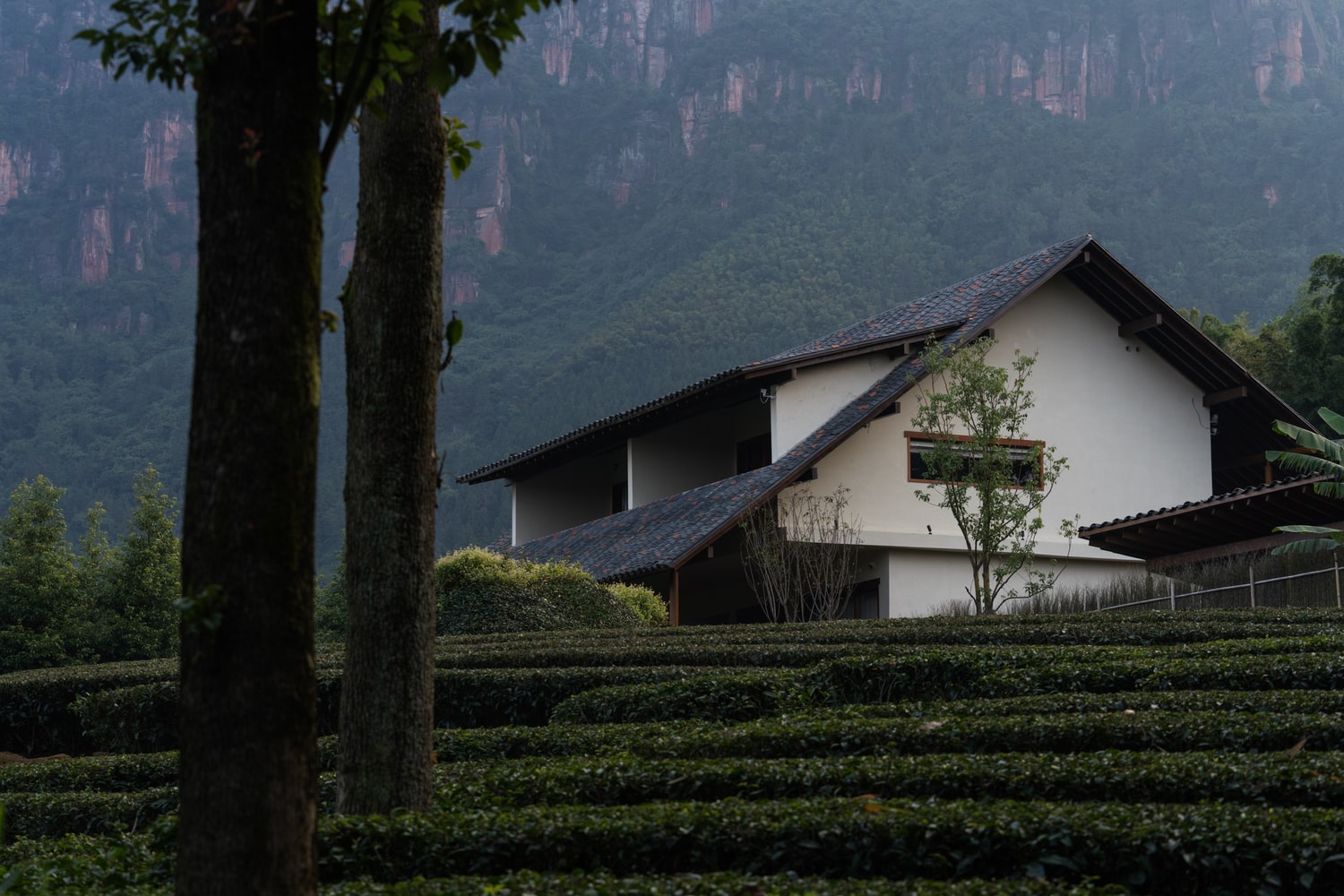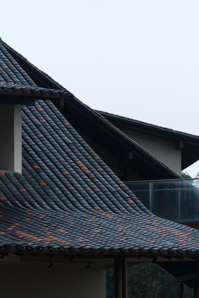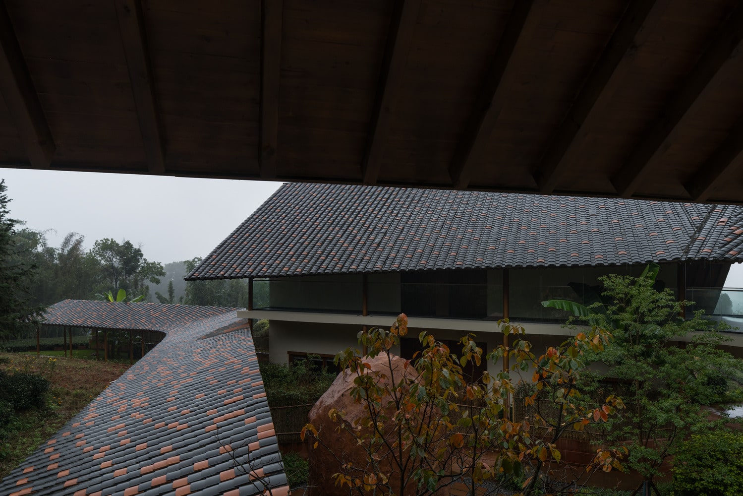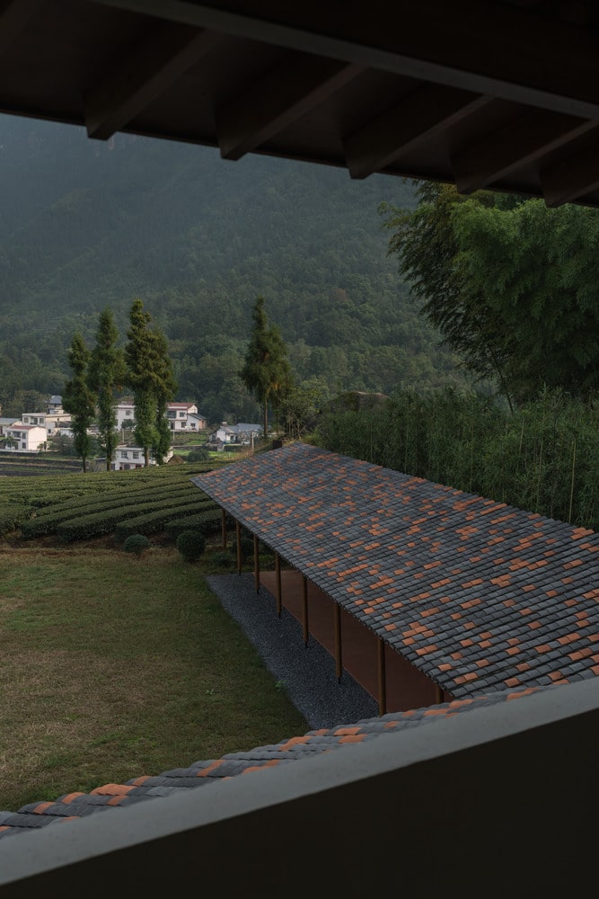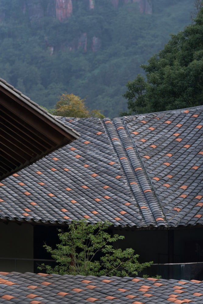 Mountain Retreat reinterprets Southern Sichuan folk architecture through a minimalist, modern lens. Traditional materials—such as small blue roof tiles, warm white straw-painted walls, and timber trusses—are paired with locally sourced red rock to create a timeless composition. The roof design, inspired by overlapping tea leaves on the hillside, blends seamlessly with the landscape. From above, its undulating pattern mirrors the mountain’s natural folds, establishing a rhythmic connection between built form and terrain.