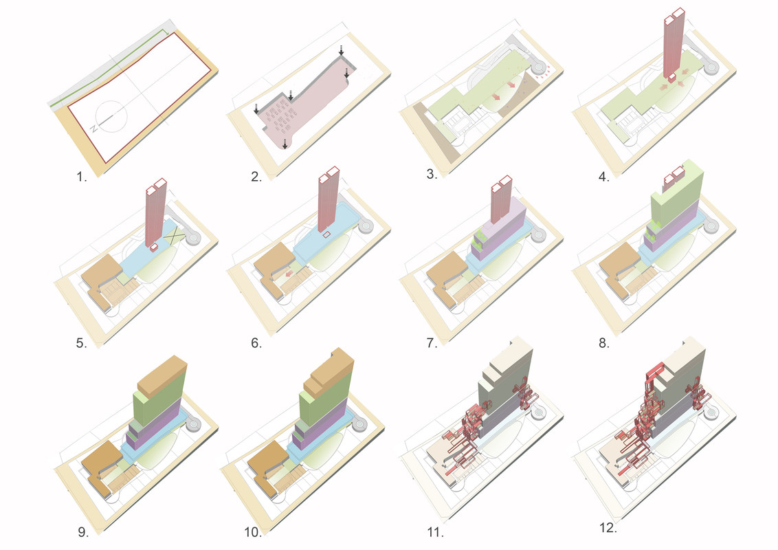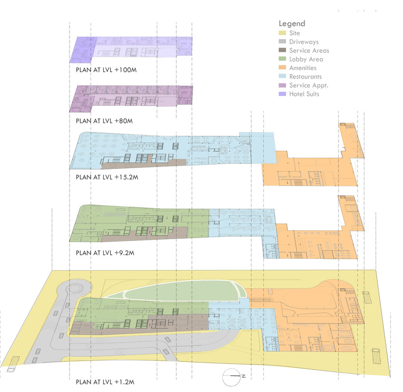 7. Service apartments stacked above the restaurants form the lower level of the tower structure, followed by the suites.