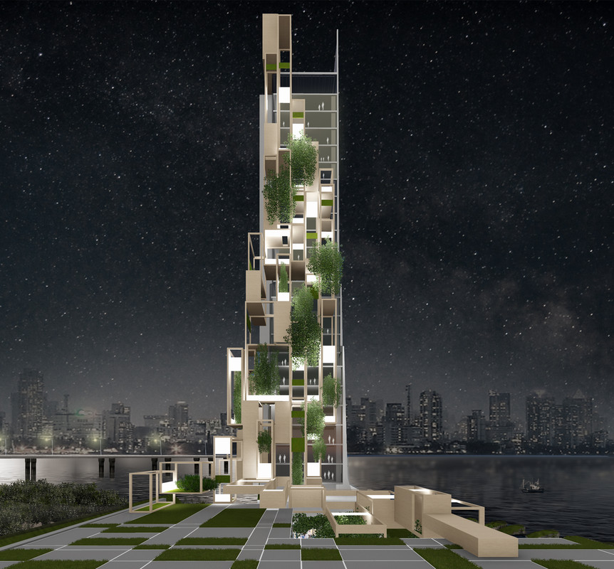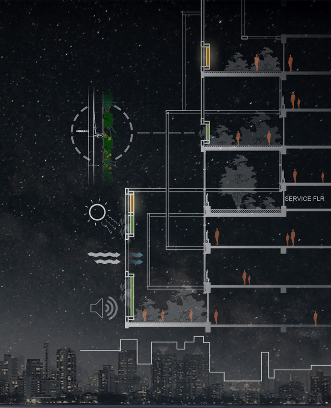A structured grid encapsules the tower forming the main design feature, that reminisces the opposite of a parasite growing over a host. It intends to REVERSE THE CONCRETE JUNGLE with vertical gardens sprawling over the structure as opposed to the concrete towers darting in a typical metro city. The grid binds various parameters like: