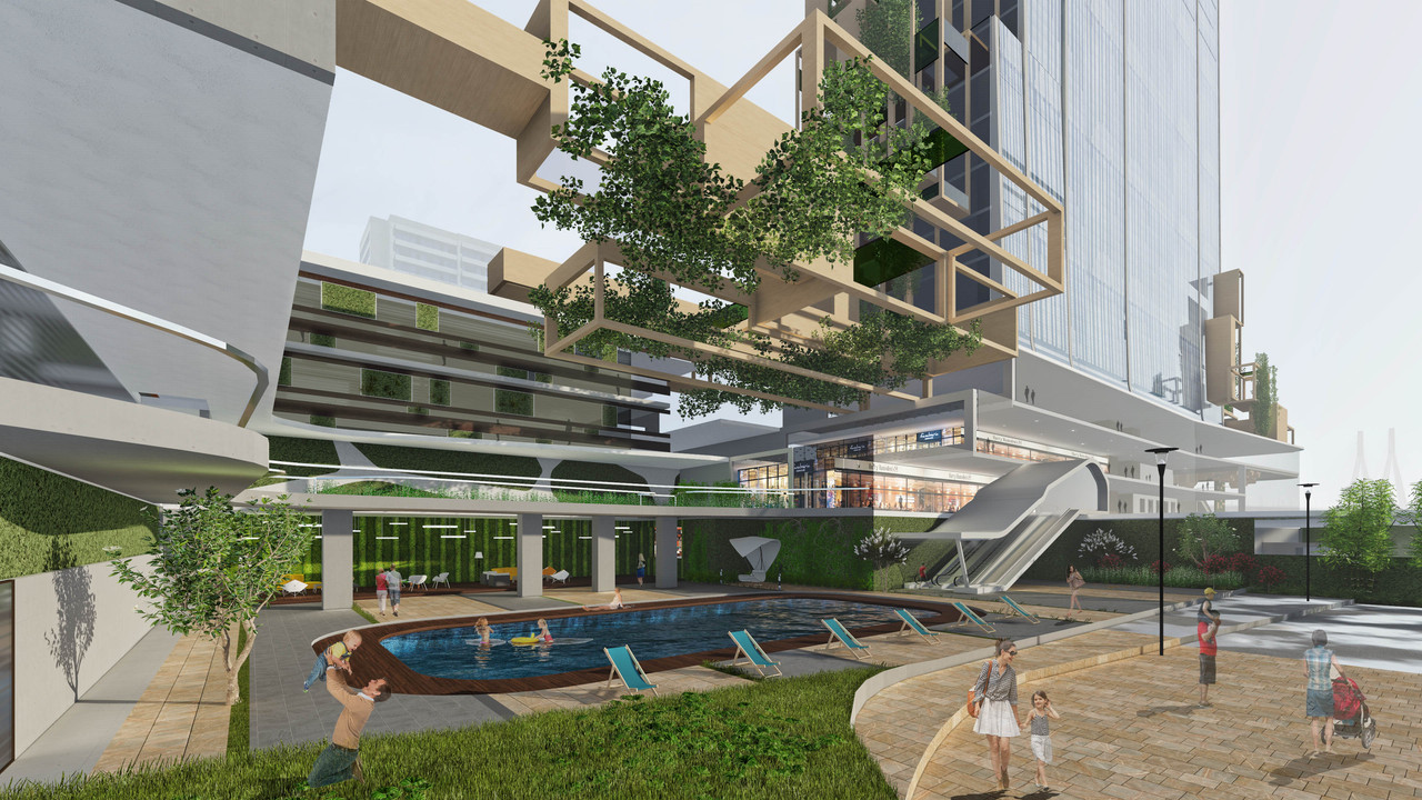 10,11. Interstitial terraces on various floors break the monotony of the concrete jungle.The GRID grows upon the structure to form canopies for the pool.