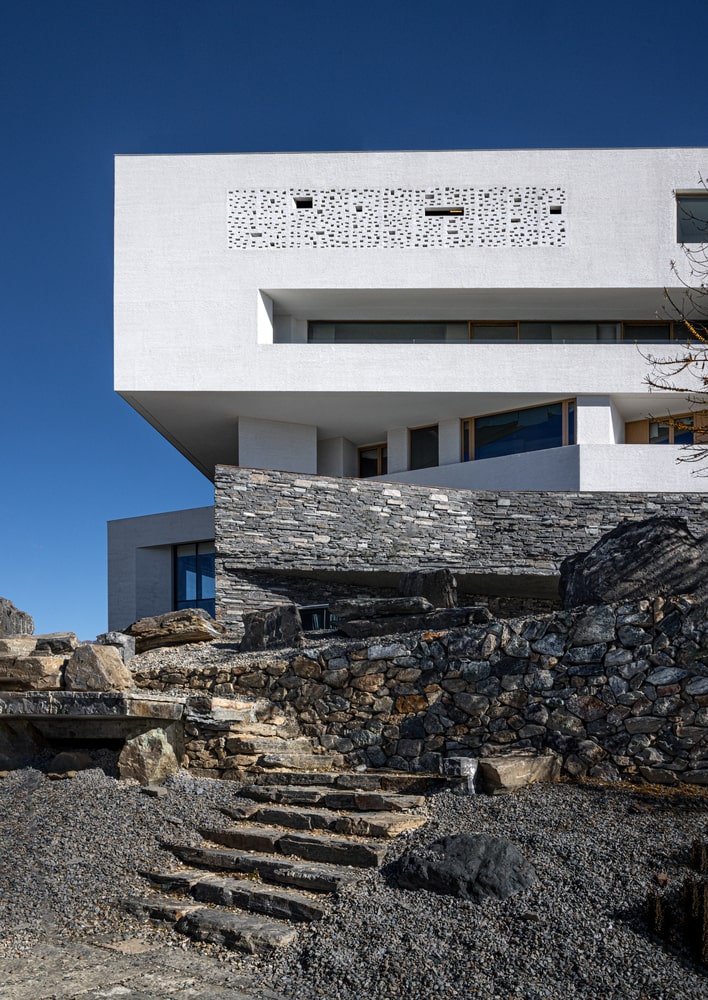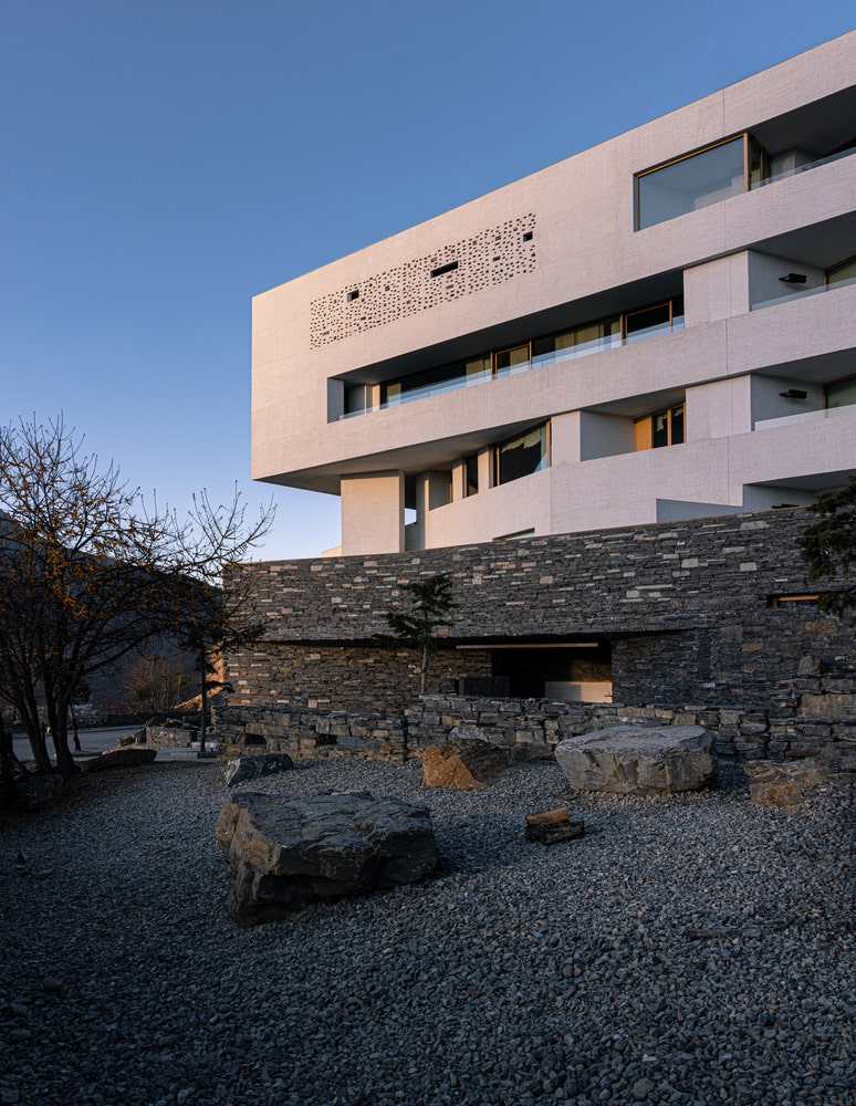 The hotel’s design emphasizes coexistence with nature rather than domination over it. By extending horizontally and stepping down the slope, the structure minimizes visual disruption while maintaining a strong presence within the site. The use of natural and locally sourced materials enables the hotel to merge seamlessly with its surroundings, fostering a dialogue between architecture and environment. Outdoor terraces, balconies, and intermediate courtyards further enhance this connection, allowing guests to encounter the landscape directly, unmediated by walls or barriers.