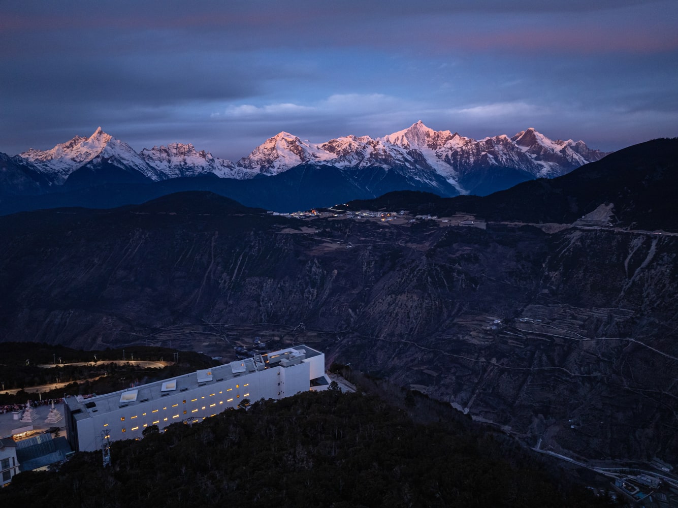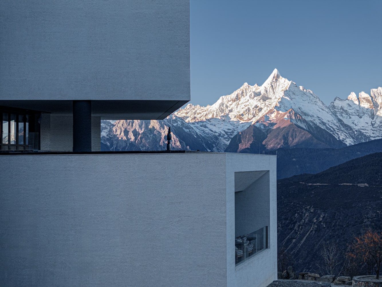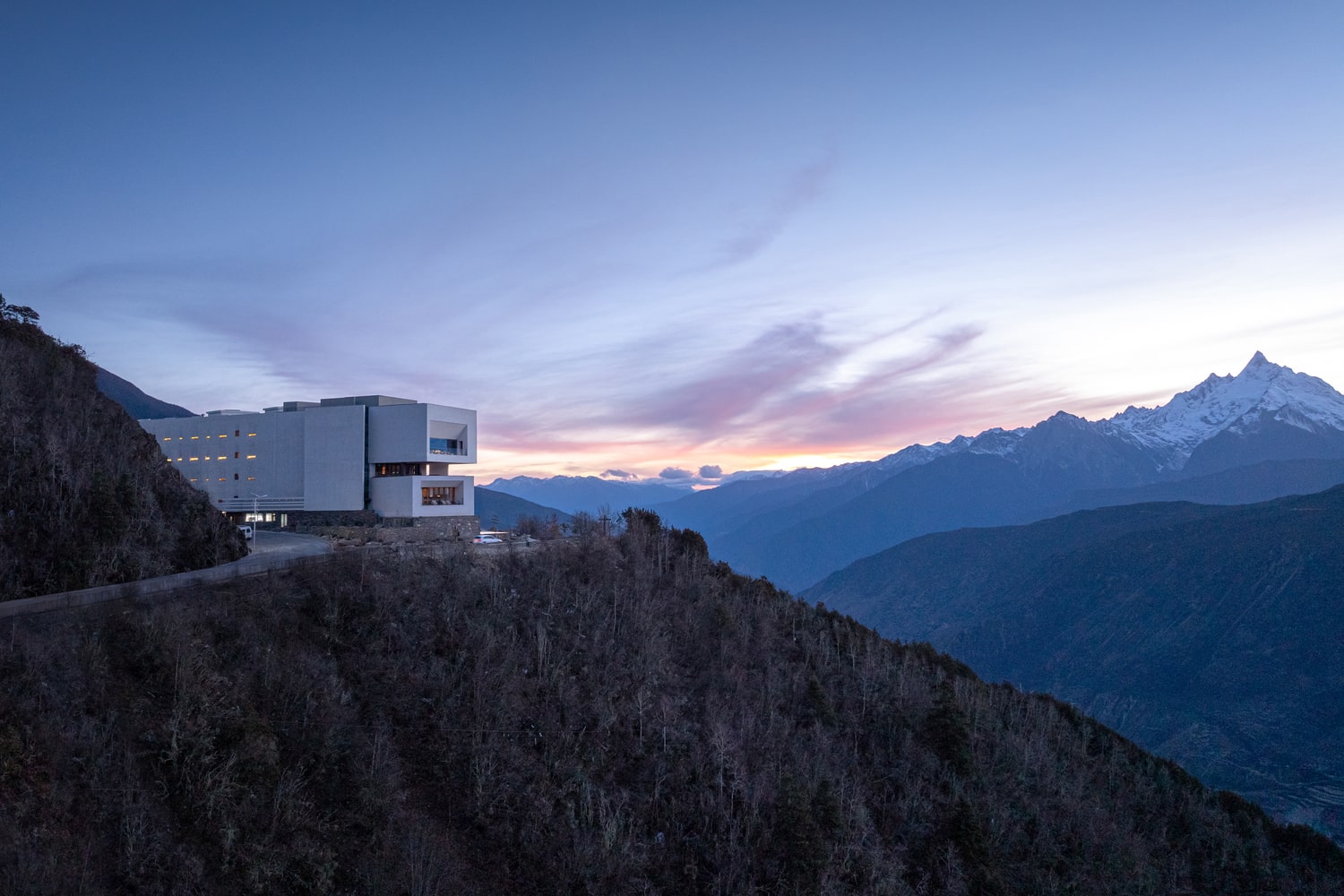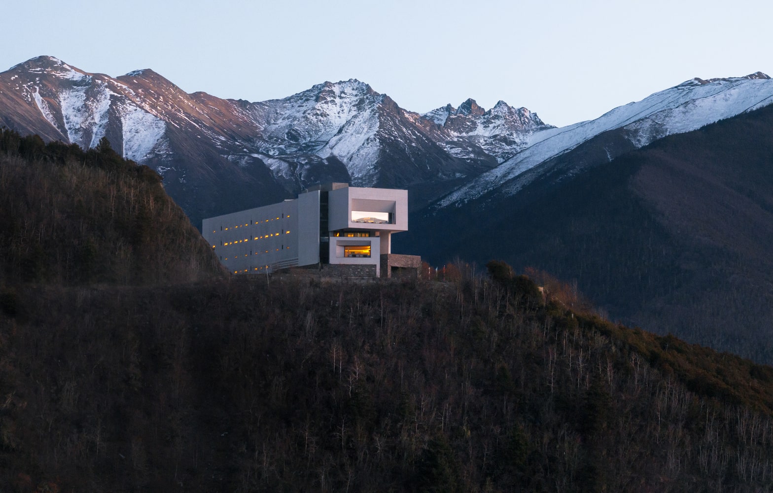 Perched at 3,600 meters above sea level on the Wunongding Viewing Platform east of the Meri Snow Mountain, the Poodom Deqin Meri Hotel is strategically located to face the sacred Thirteen Peaks of Meri. This remarkable natural tableau extends for a hundred miles, creating a panorama of snow-capped summits that shifts with the seasons. Behind the hotel rises the Baima Snow Mountain, while on one side a dramatic valley plunges nearly vertically toward Deqin County. Such a formidable setting demanded an architecture of subtlety, respect, and harmony, rather than exaggerated gestures or monumentality.