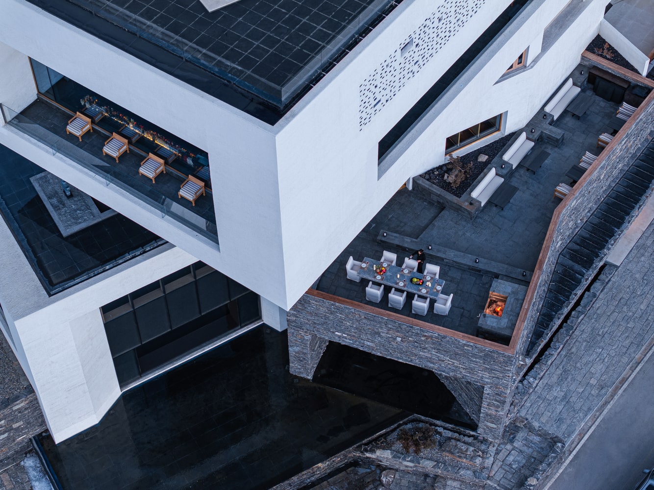 Poodom Hotel unfolds as a horizontal composition, mirroring the natural ridges and contours of the alpine terrain. Its staggered levels articulate a series of spaces that vary in scale and intimacy, encouraging exploration and engagement with both the interior and surrounding landscape. Circulation is designed as a ritualized movement, guiding guests along pathways that frame dramatic sightlines and reveal shifting views of the peaks. The sequence of spaces transforms mere circulation into a sensory pilgrimage, where each corridor, terrace, and stair becomes an encounter with the mountains.