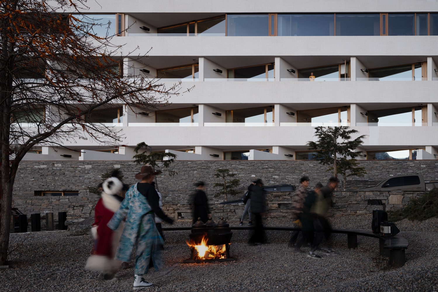 The hotel’s design philosophy centers on the role of architecture as a mediator between nature and culture. Rather than imposing a rigid form upon the landscape, the building seeks to amplify the intrinsic energy of its surroundings, translating it into an immersive, contemplative experience for guests. Every spatial decision—horizontal extension, staggered levels, rotated volumes—is guided by a desire to weave interior and exterior environments together, creating fluid transitions between intimate and open spaces. The architecture dissolves into the Tibetan landscape, employing pure hues and locally sourced materials that echo the mountains’ textures and tones.