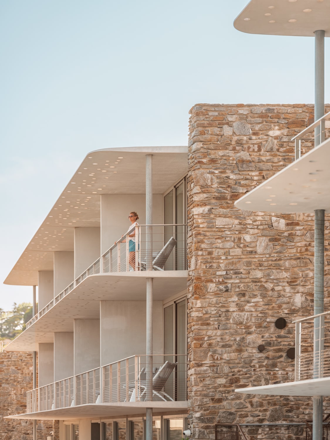 Locally quarried Bormes stone defines the base, grounding the hotel in the geology of its setting and lending a sense of permanence and gravitas. By contrast, UHPC slabs and overhangs bring lightness—fine-edged, perforated, and sculpted to filter the sun’s intensity. This duality between solidity and transparency expresses a subtle dialogue between tradition and innovation, between material weight and technical finesse.
