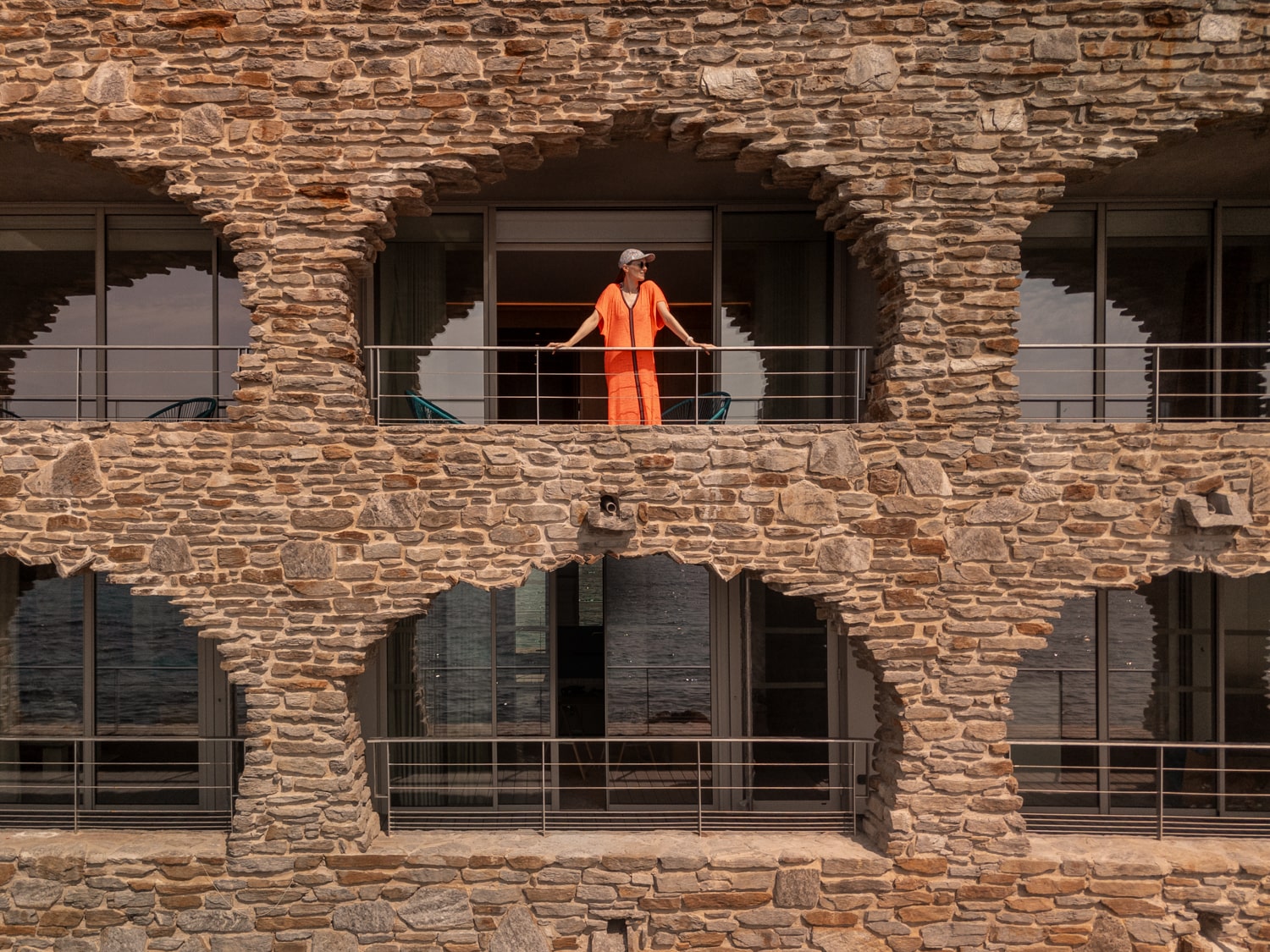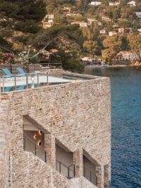 The lower level, clad in locally sourced Bormes stone, contains the guestrooms closest to the sea. Vaulted and partially embedded in the slope, these rooms evoke the feeling of sleeping within a grotto—thick, textured, and in direct dialogue with the water. Above, a horizontal platform forms the heart of the hotel, accommodating the reception, restaurant, pool, and shared amenities.