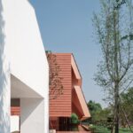 YongLi Red Tile Plaza offers a collection of dining pavilions arranged in a village-like configuration. Each pavilion is conceived as an independent architectural volume, accompanied by its own private garden, creating intimate spaces for culinary experiences. White-clad garden cloisters connect these volumes, guiding visitors through a choreographed sequence that balances privacy and communal engagement. Lush vegetation frames the pathways, enhancing the interplay between built form and natural surroundings. The design of these spaces emphasizes tranquility, encouraging lingering moments while maintaining visual and spatial continuity across the complex.