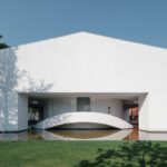 The centerpiece of the composition is a dramatic 12-meter-high gabled entrance that cantilevers four meters outward, evoking a sense of ecclesiastical grandeur while functioning as the main portal into the complex. Adjacent to this monumental gateway, the reception center emerges as a serene, white barn-like structure seemingly floating on water. Accessed via the main corridor, the reception forms a delicate threshold between the forested exterior and the interior of the plaza. A gracefully curved bridge traverses the gable opening, leading visitors toward an elevated art gallery space and initiating a fluid sequence of movement that unfolds progressively through the site.