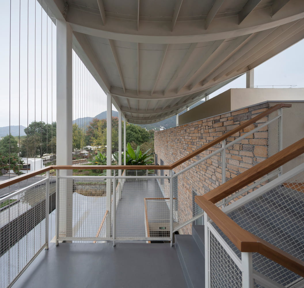 On the north side, a new external steel corridor provides access to the dormitories, acting as the main circulation spine. Meanwhile, the original corridor on the south side has been transformed into a continuous sketching balcony, offering students and artists a sheltered outdoor workspace with uninterrupted views of the surrounding mountains.
