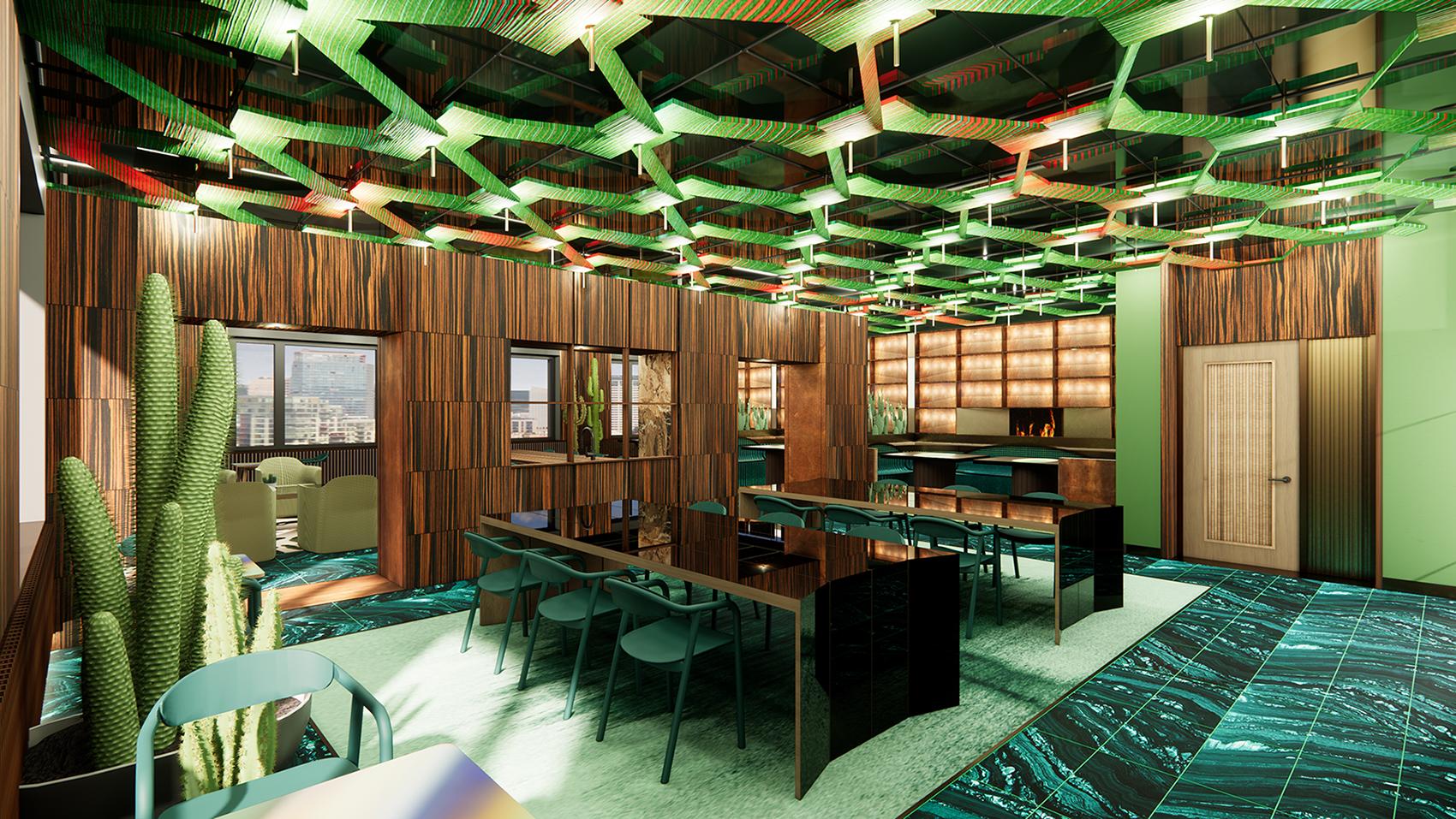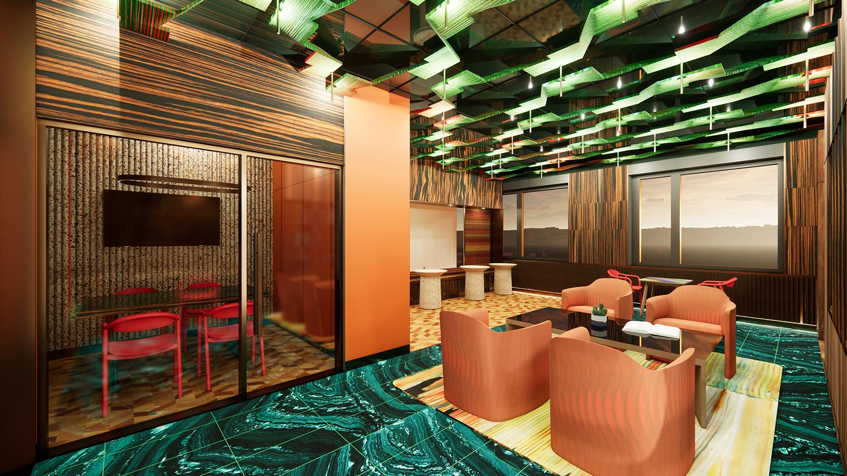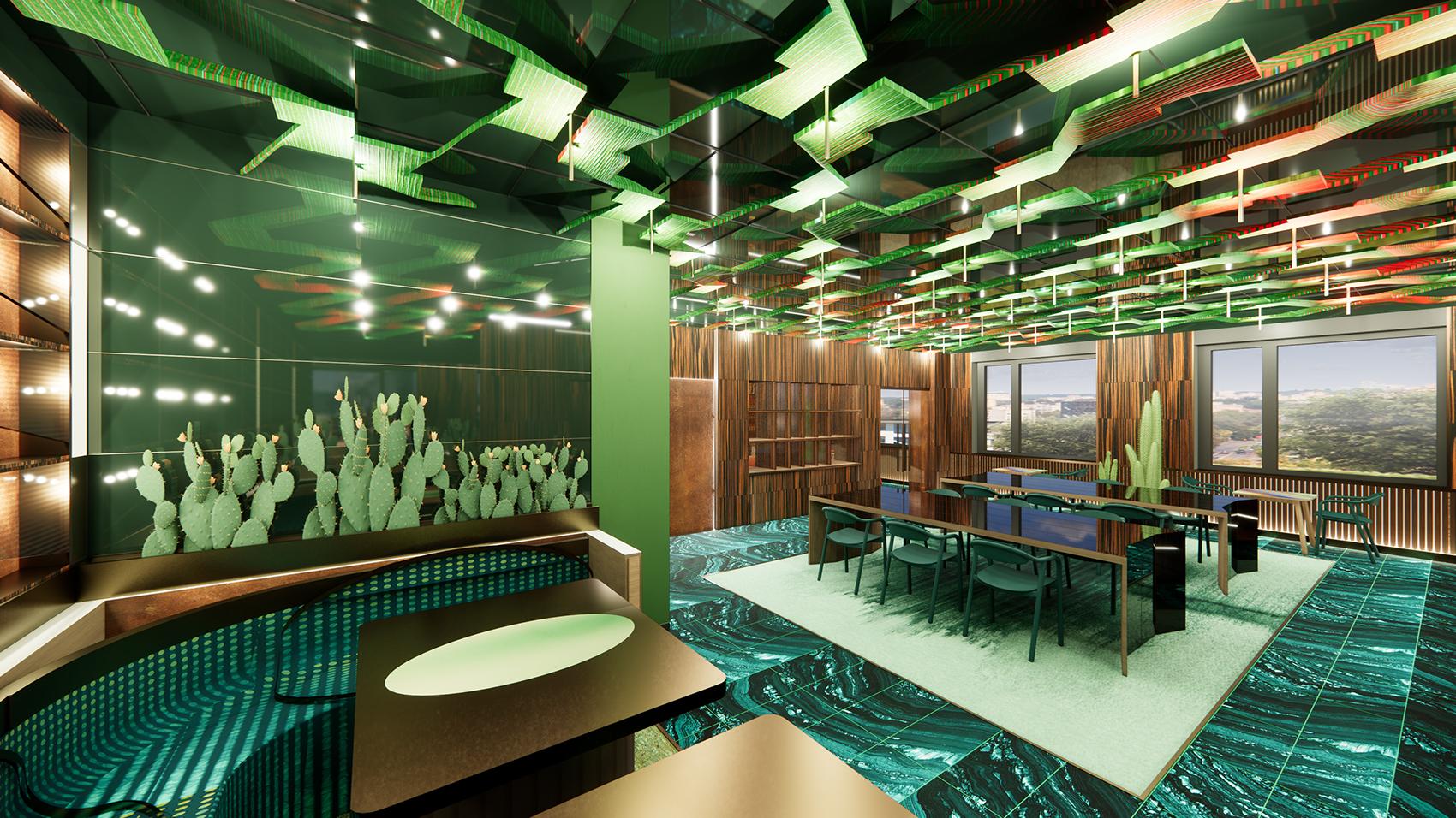 First program is a coworking desk area: black mirrored desks reflect lights from the mirror ceiling, bouncing vivid colors. Tensile felt acoustic panels absorb sounds; they are anchored by the metal fins, which are used to mount point lighting fixtures. Lights create a glistening effect all around the room. Green felt, carpets and tiles are representative of ever-growing nature. In Juxtaposition, macassar ebony wood is used to create free standing millwork walls.